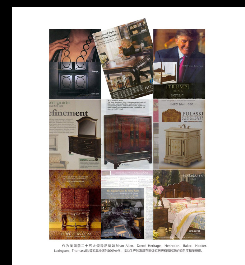 作為美國前二十五大領(lǐng)導(dǎo)品牌如Ethan Allen、Drexel Heritage、Henredon、Baker、Hooker、Lexington、Thomasville等家具業(yè)者的誠信伙伴,福溢生產(chǎn)的家具在國外家居界有著較高的知名度和美譽度