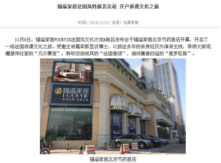 11月8日,福溢家居在北京芍藥居店發(fā)布法國風(fēng)家具新品,包括豪華的凡爾賽玫瑰系列、經(jīng)典的法國香頌系列、以及休閑的普羅旺斯系列。同時(shí)舉行了法國風(fēng)文化講座,邀請旅法多年的郭昱沂博士帶領(lǐng)我們沿著視覺、聽覺、嗅覺、觸覺以及視覺來感覺浪漫的法蘭西。