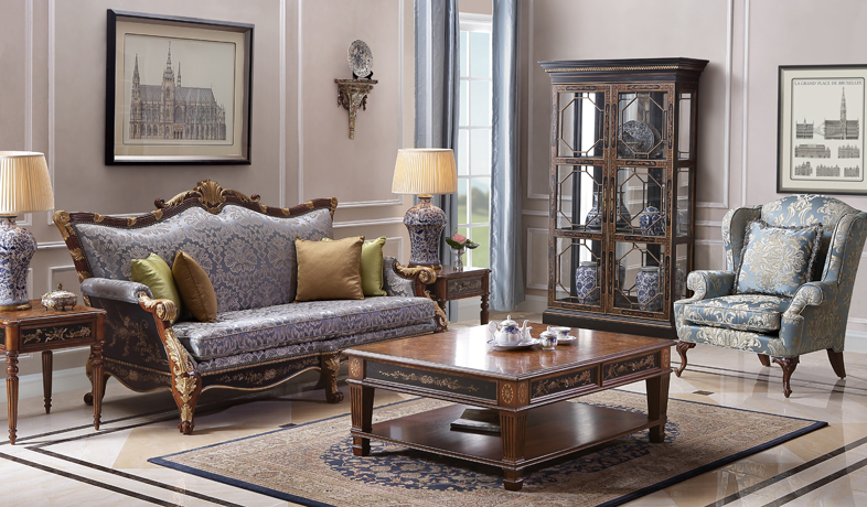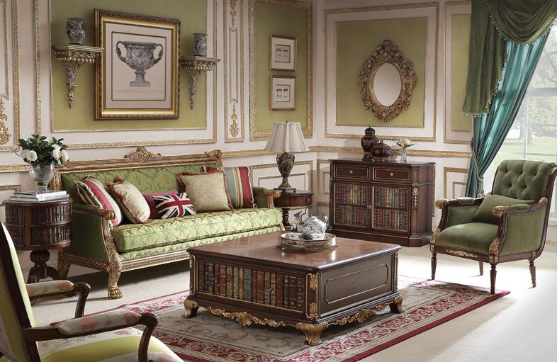 還原英國近郊溫莎城堡房間內的珍稀古董家具,重現摩登18世紀的奢華皇室生活。以象征希望、和平的綠色為主基調,書本彩繪飾以仿古效果為豪門大宅增添了幾許書卷情韻,描金的花朵、藤蔓雕刻,點綴出貴族生活的品位與真諦!