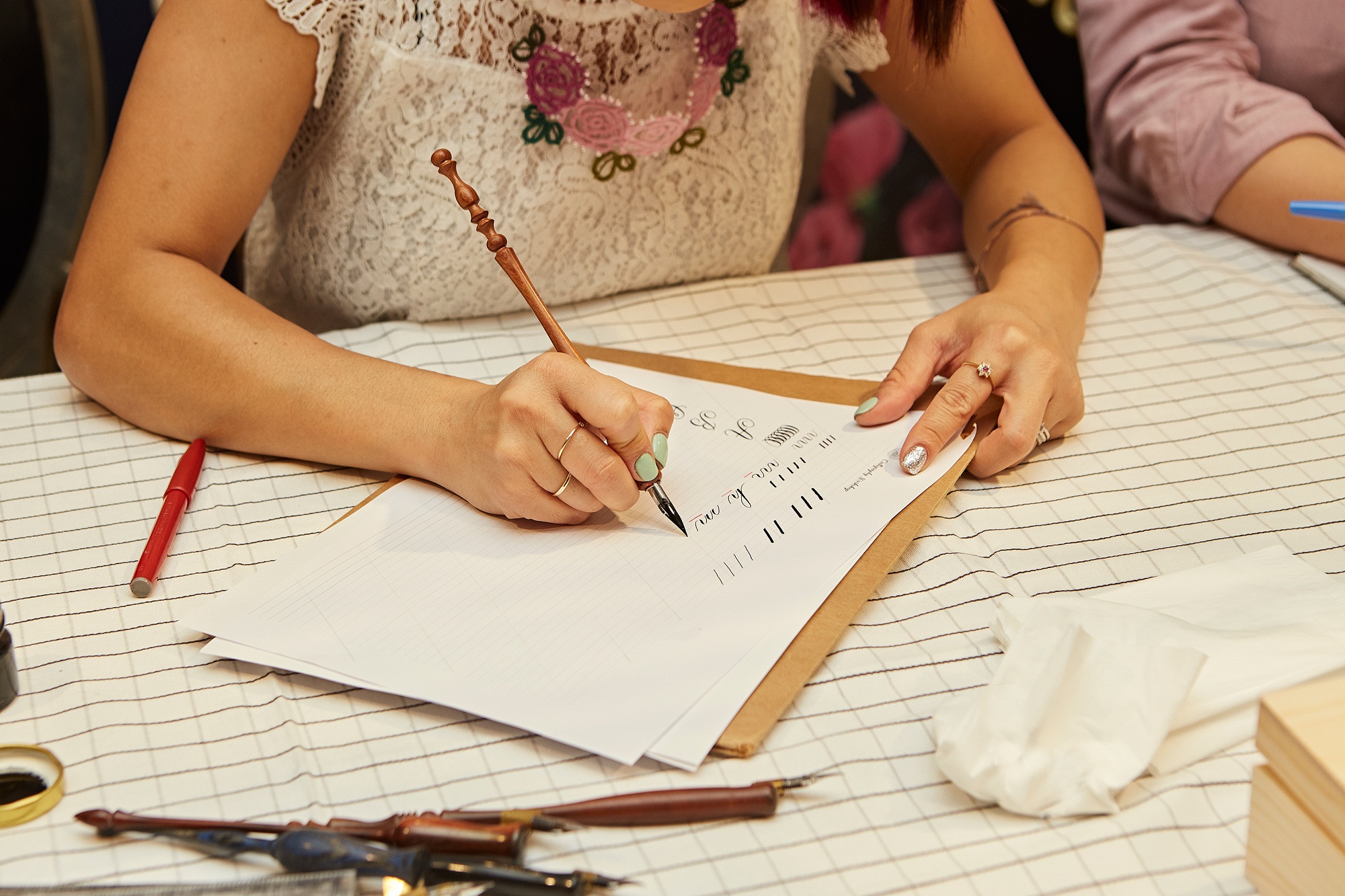 Kalo Chu從英式書法的歷史演變到書法筆桿筆尖的組裝、鑲嵌;再到握筆坐姿、墨水的蘸取、提筆勾字的角度技巧……事無巨細地進行了一一的講解