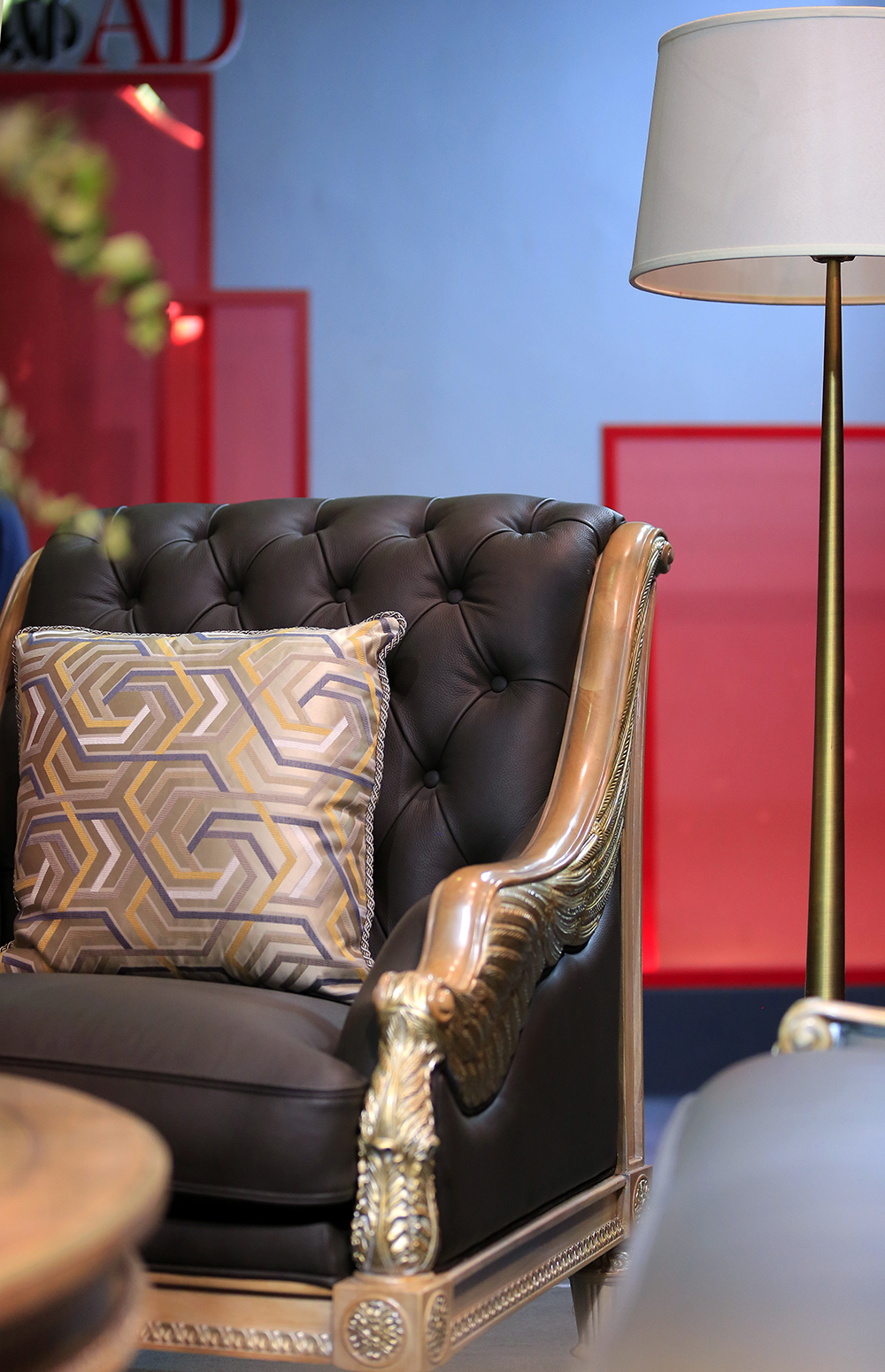 福溢家居的新古典主義摩登沙發與德國瑪堡壁紙Zaha Hadid《Hommage永恒之光》系列的紅色華麗線條鋪陳,讓古典與摩登在此交匯,變成一場設計無界的對話。