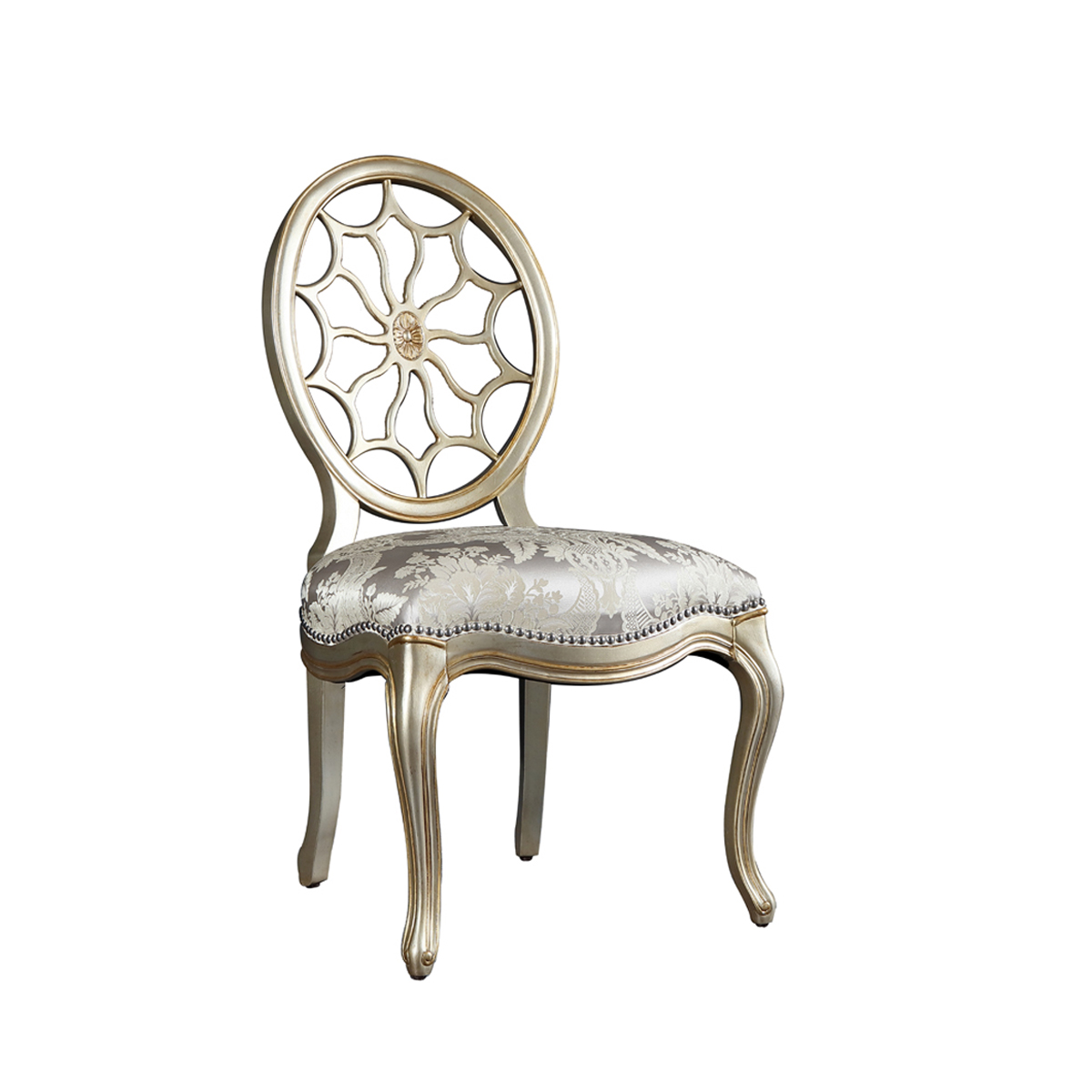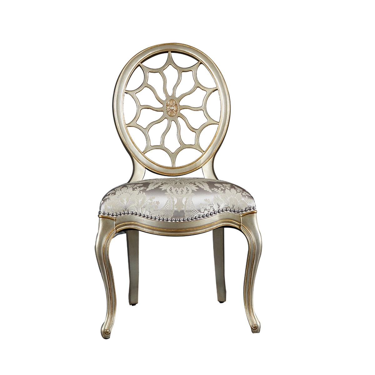 * 參考喬治三世時期的古董造型設計,使用輪子構造椅背和安妮王后腿,配以精致的手工雕刻細節和涂金工藝、布藝面料和厚實柔軟的填充物,是豪華系列凡爾賽玫瑰法式單椅的特色.