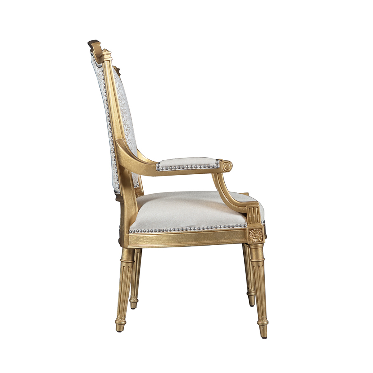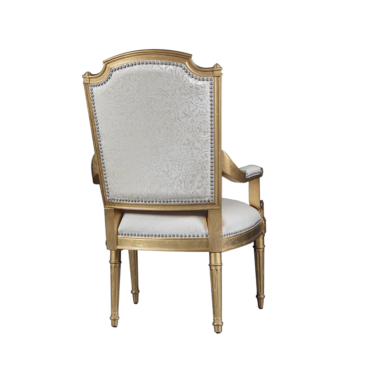 赫普爾懷特風格的盾形背搭配車織雕刻腿比例優美,造型優雅,兼有古典式的華麗和路易十六式的纖巧。描金工藝與淡黃色軟裝布藝的交織,是自然的色彩密碼與權利至上的象征。