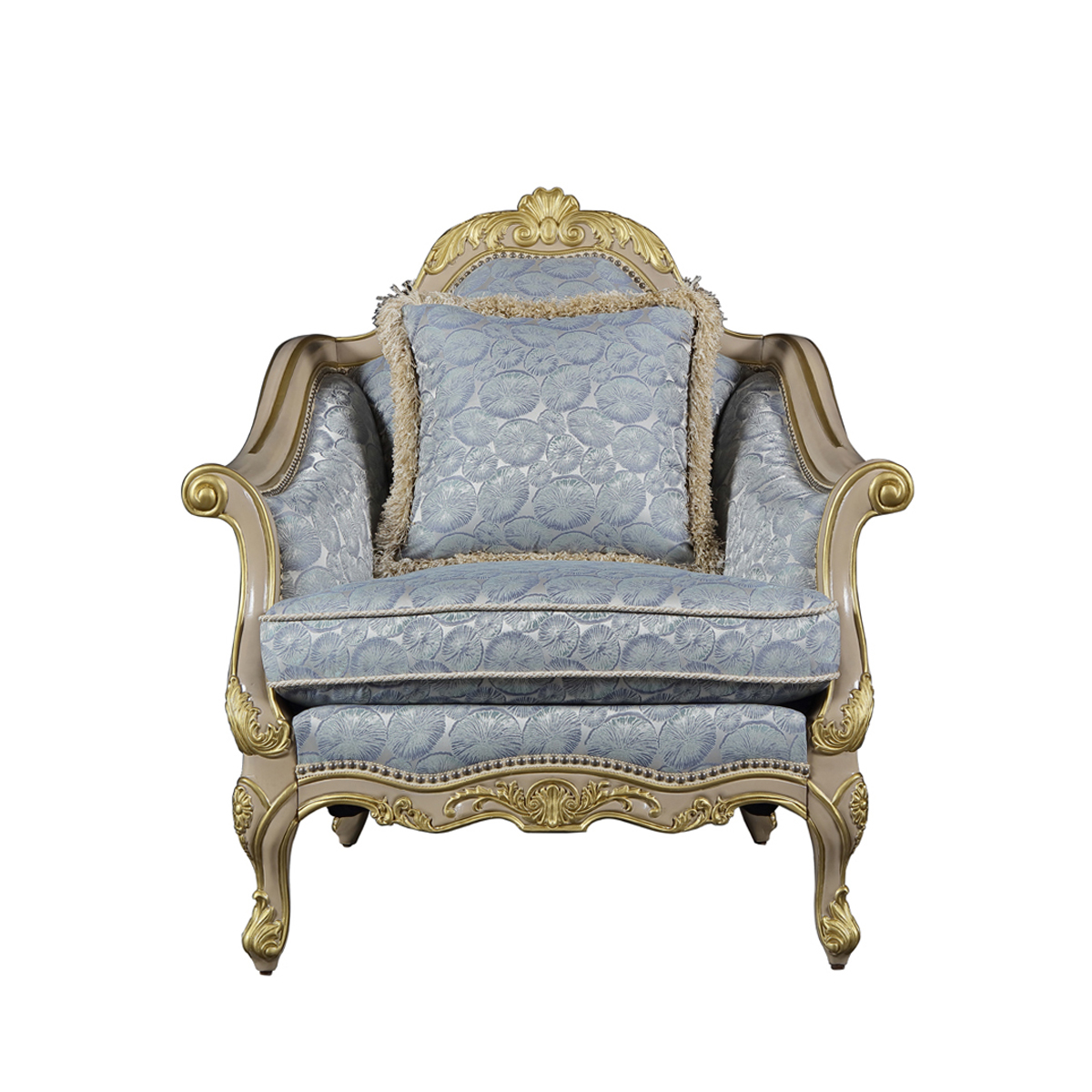 * 線條的沙發造型猶如連綿不斷的花海,實木的藤花雕刻搭配繁花點綴的沙發布藝,盡情演繹普羅旺斯的萬種風情,行如流水的銀色釘扣,給自由的生活空間裝飾上浪漫的色彩。