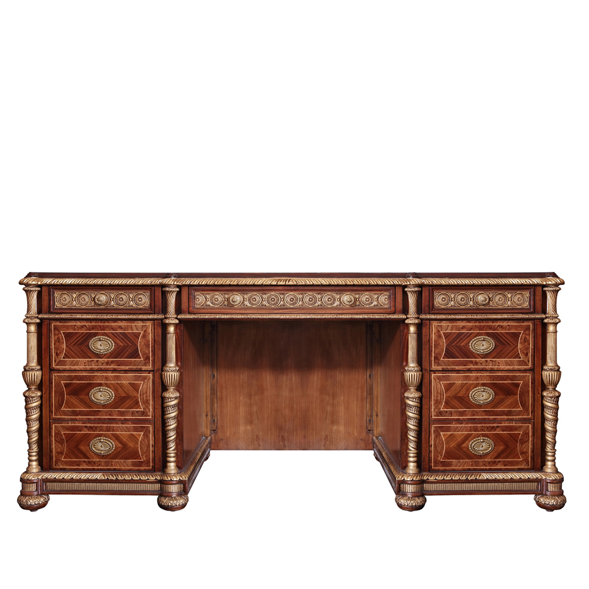 采用謝拉頓風格經典桌腿,上端配以常用的箍和腳輪,參考優(yōu)雅高貴的 Ionic Order(愛奧尼克式羅馬柱)雕刻,鑿刻出精致的手工雕刻細節(jié),以及輔以紋理清晰而有層次的木皮拼花,帶來溫莎堡皇廷般奢雅的辦公體驗。