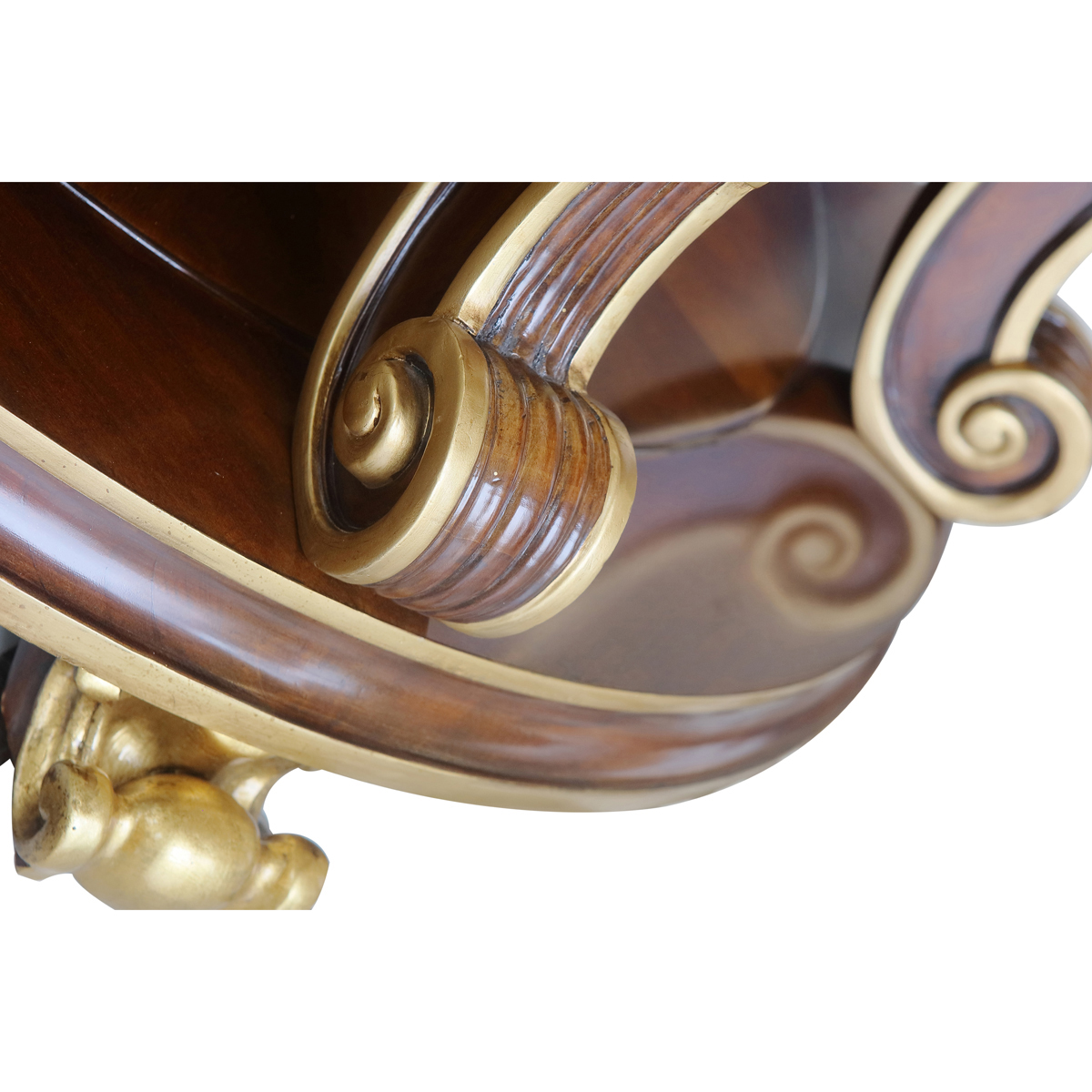 為表現英國皇室的華麗和莊嚴,以英國溫莎堡為設計元素。使用雕刻描金葉飾花紋,表現出英國王室的典雅氣質,配上代表勝利的旋渦狀支撐柱、精致的手工雕刻細節和貼金箔工藝,完美演繹了英式宮廷家具的奢華尊貴,可謂是極具典藏價值的傳世之作。