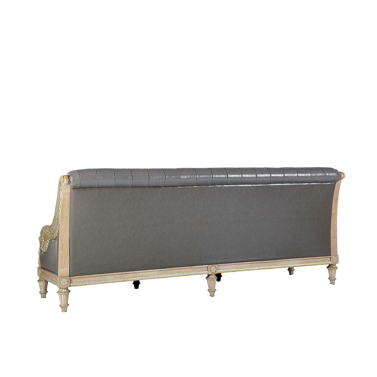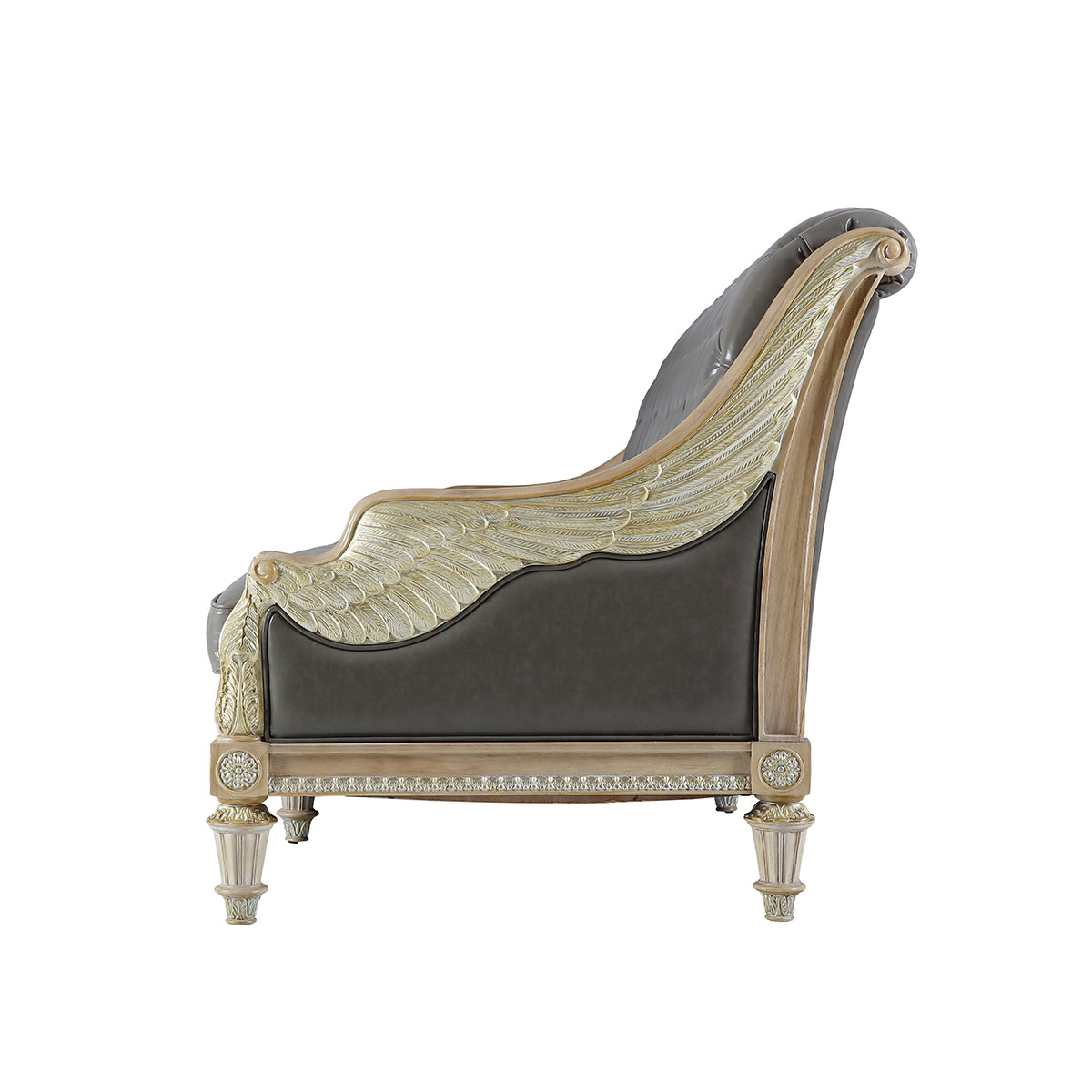魅影灰邂逅灰褐色,皮質珍奢而不失大氣之姿;設計雕刻出勝利女神-Samothrace翅膀扶手,羽翼豐滿的羽毛雕刻極為精巧經典,援引古典常用的色彩,以簡飾繁;錯落有序的條紋回路蘊藏著達•芬奇的繪畫創作靈感,拉斐爾的建筑設計妙思以及米開朗基羅的雕塑精粹。