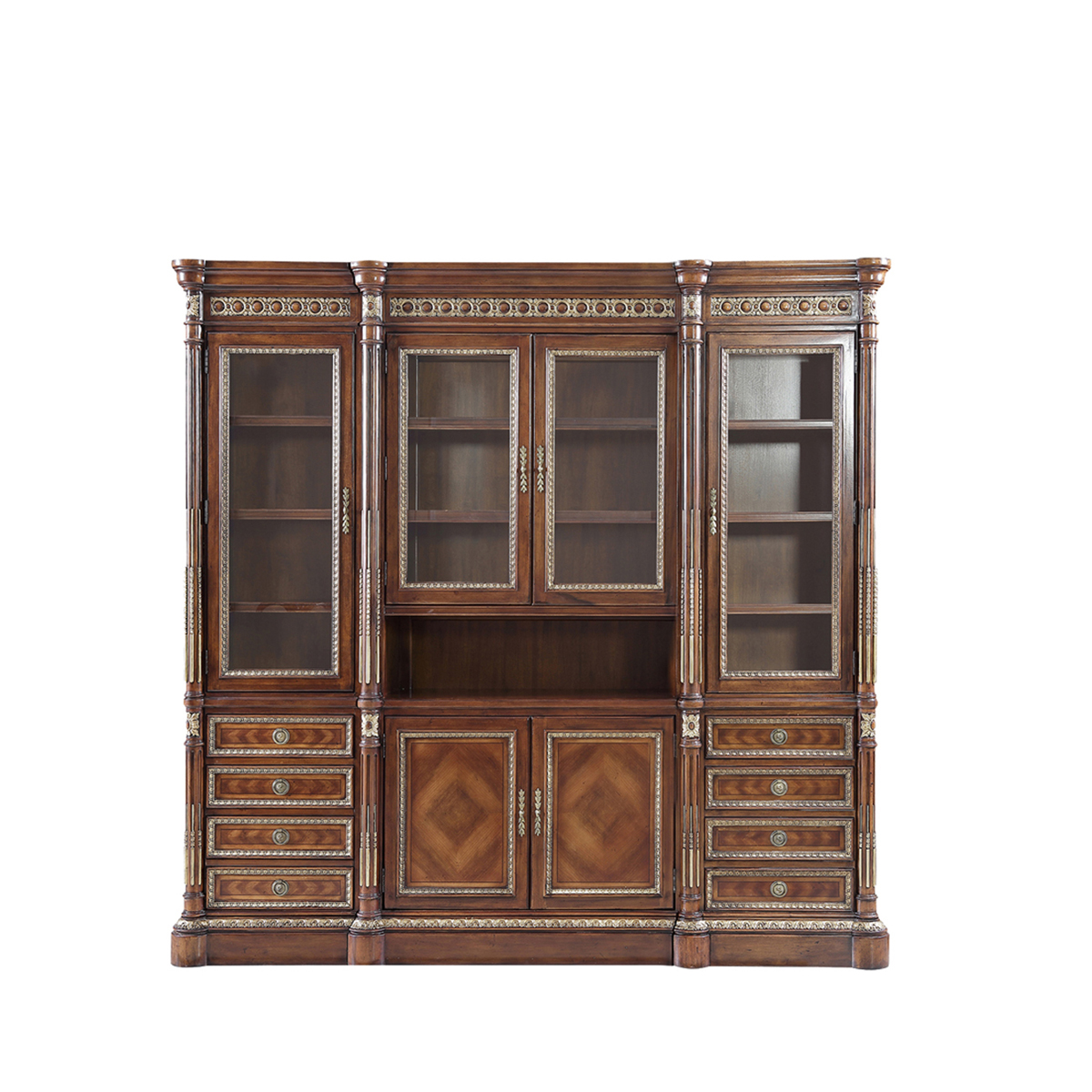 以法國(guó)凡爾賽宮為設(shè)計(jì)元素,表現(xiàn)法國(guó)路易時(shí)期的莊嚴(yán)和浪漫。多隔層大容量的合理設(shè)計(jì),功能完善的組合書柜,是蘊(yùn)藏知識(shí)和靈感的空間,木皮拼花紋理增添藝術(shù)韻味,是家中的“博物館”,讓我們與外界的關(guān)系更密切,帶玻璃門設(shè)計(jì)既美觀又能起到防塵防污效果。
