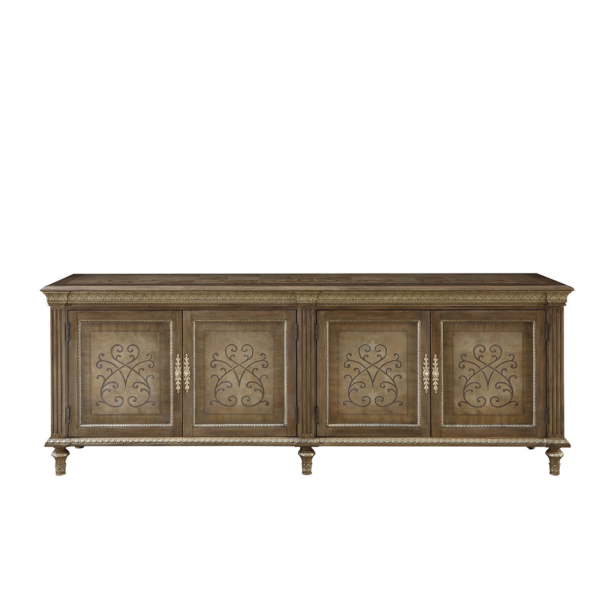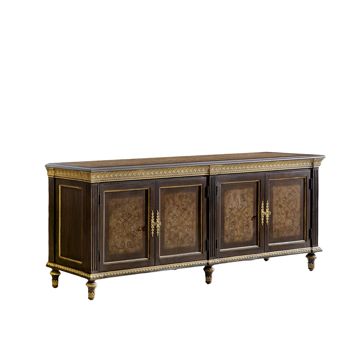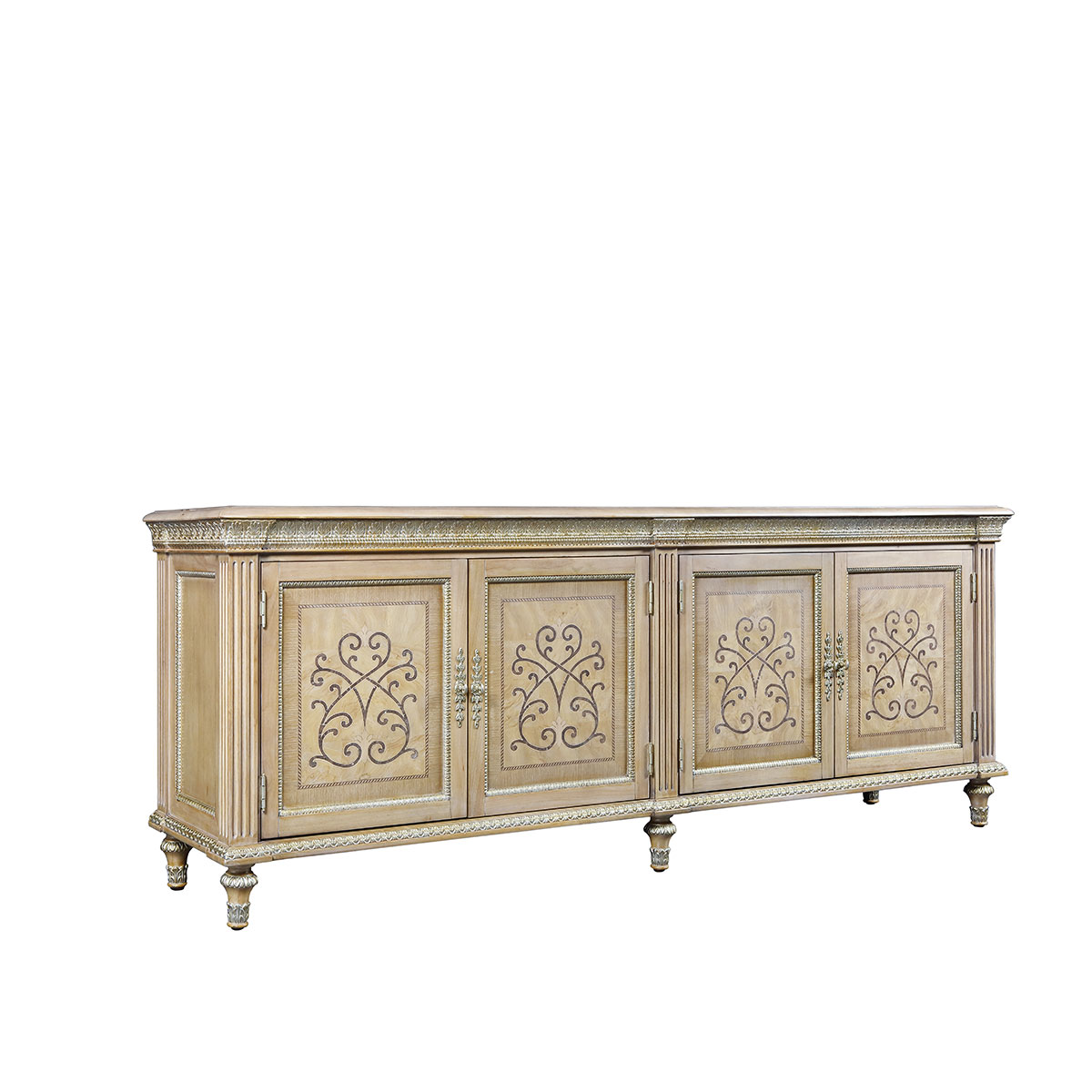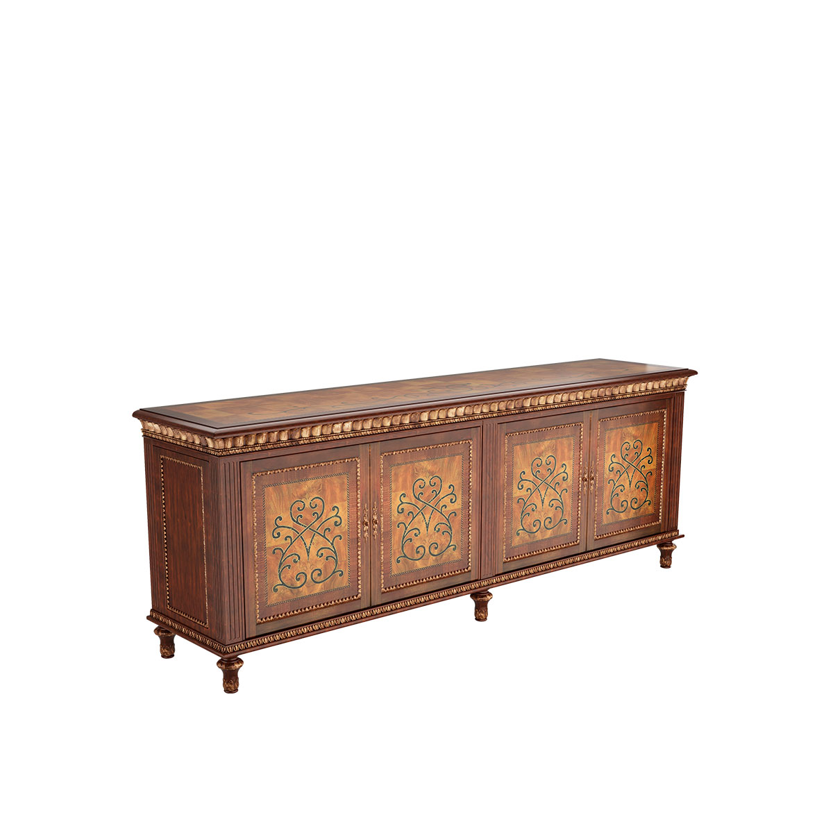 翡冷翠電視柜白栓樹瘤、橡木皮、楓木等多種木皮進行手工拼花彰顯了古老手工技藝的迷人魅力,手工雕刻、木皮拼花都是華美的獨特樣式,傳承經典,彰顯宮廷華麗。