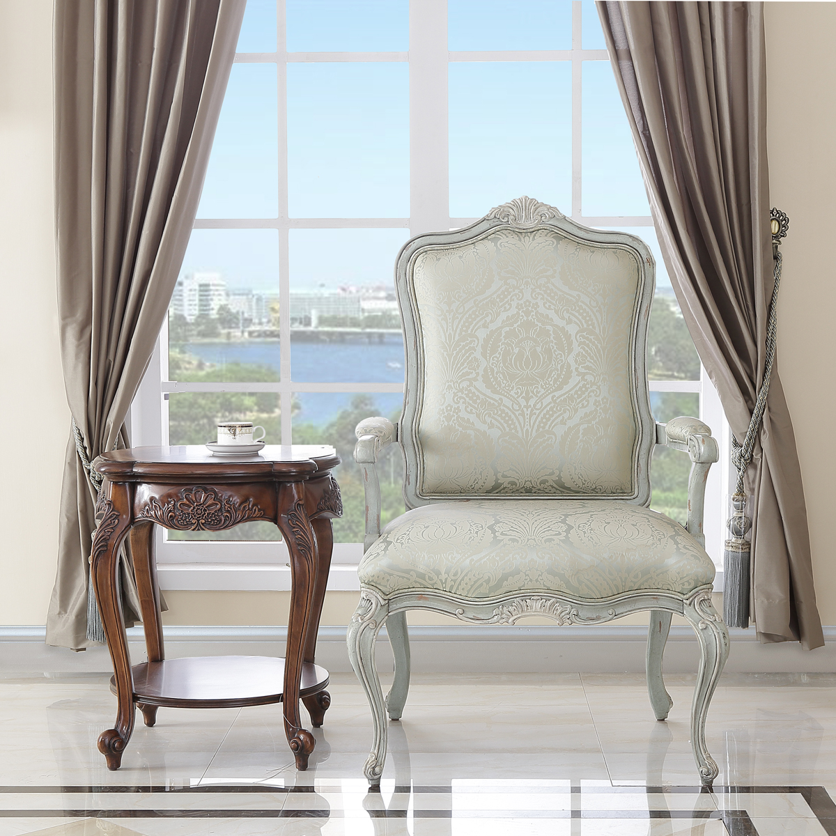 * 浪漫的香頌猶如歷史悠久的杜樂麗花園般,每每散發著其獨特的韻味。為表現杜樂麗花園的休閑愜意,使用花環、藤蔓和卷葉造型的實木手工雕刻,配以法式彎腿、木皮貼面和層板設計,營造出濃情蜜意的法式生活空間。