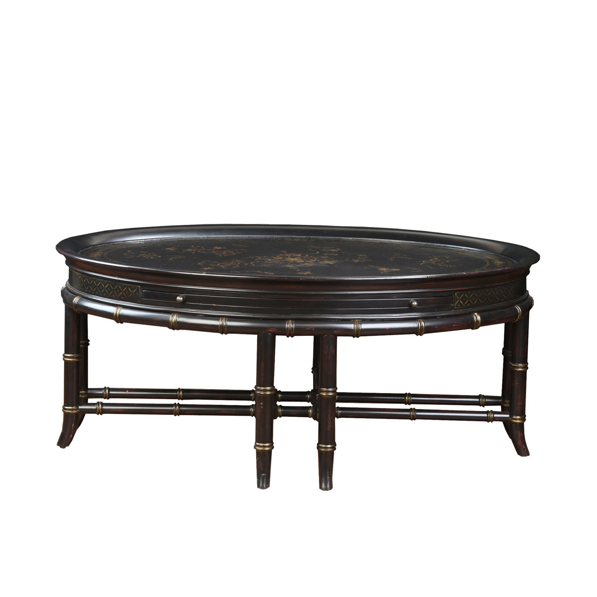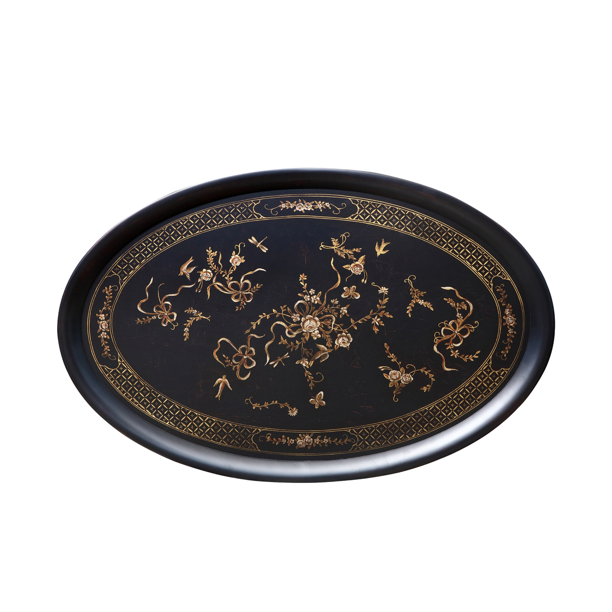 * 以18世紀英吉利——“日不落帝國”為設計主題,把東西方的多種藝術元素結合在一起。有來自東方意念的竹子造型車枳柱和高貴的黑底金漆配搭;也有參考東方山水畫的手繪植物圖案。配上托盤式面板設計,是經(jīng)典系列英吉利經(jīng)典英式橢圓咖啡桌的特色。
