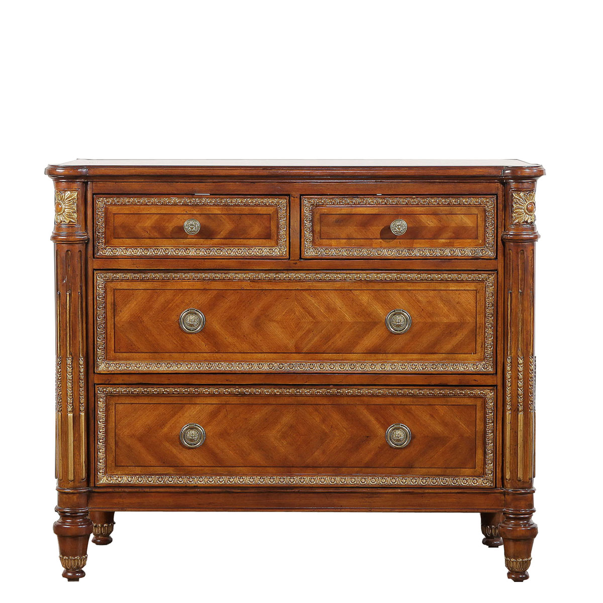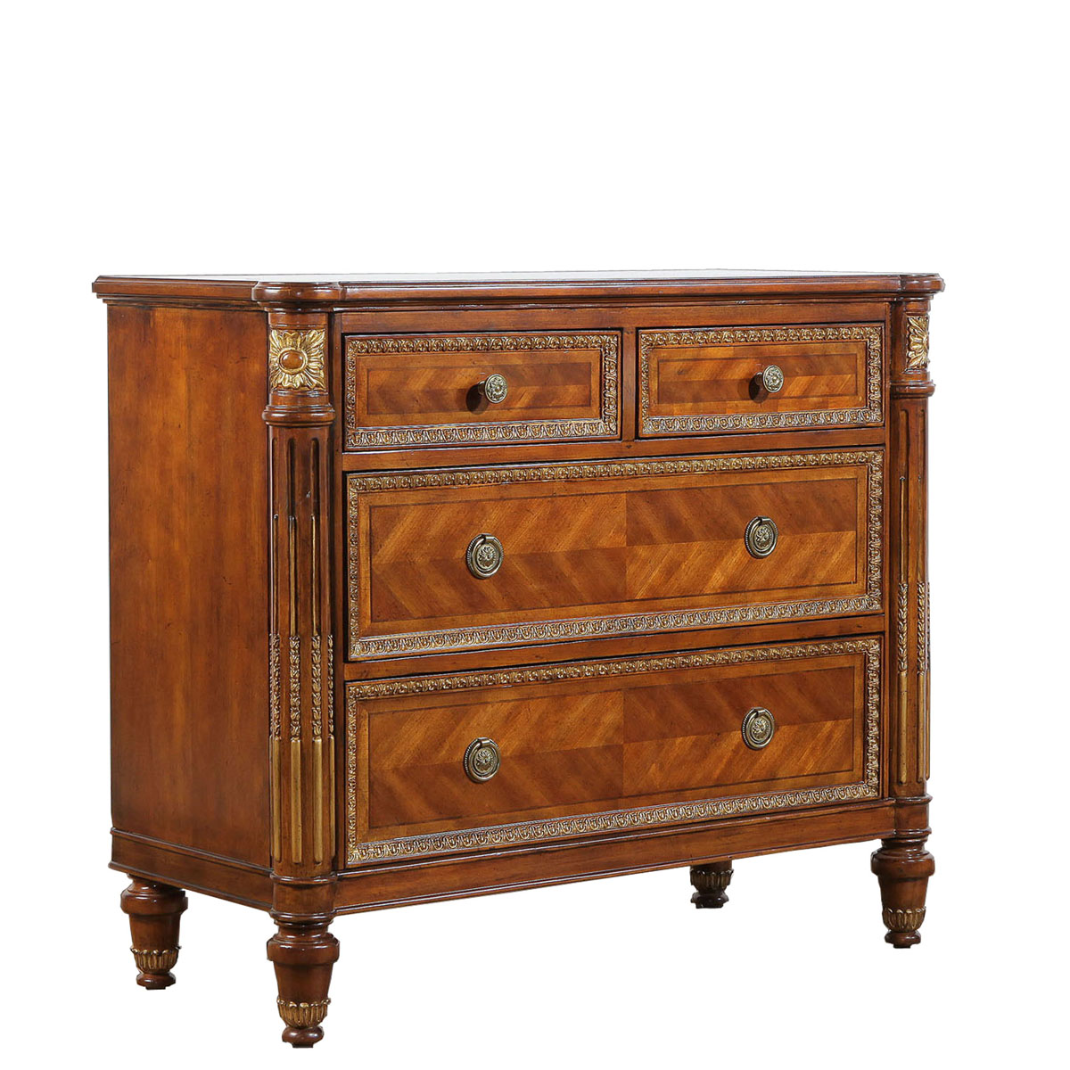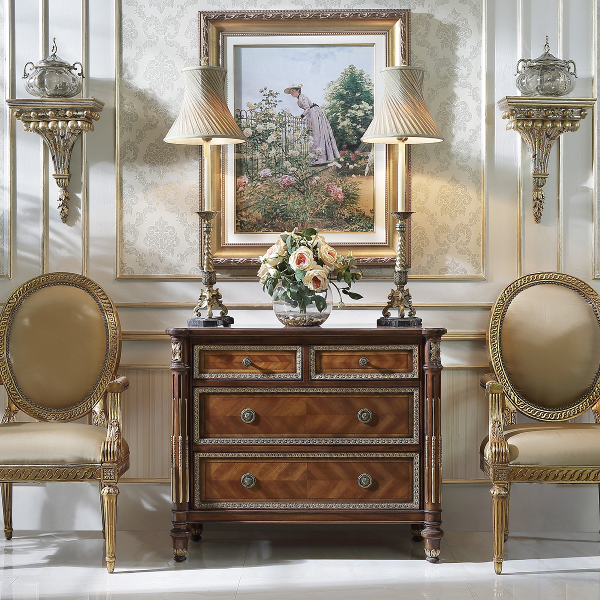 * 為表現(xiàn)法國路易時期的莊嚴(yán)和浪漫,以法國凡爾賽宮為設(shè)計元素。使用歌頌路易十四時期的太陽花雕刻,顯示其王權(quán)穩(wěn)固地位的錐形腿腳設(shè)計,配以建筑柱雕刻與鉆石圖案木皮貼面,完美演繹了法式宮廷家具的奢華尊貴。