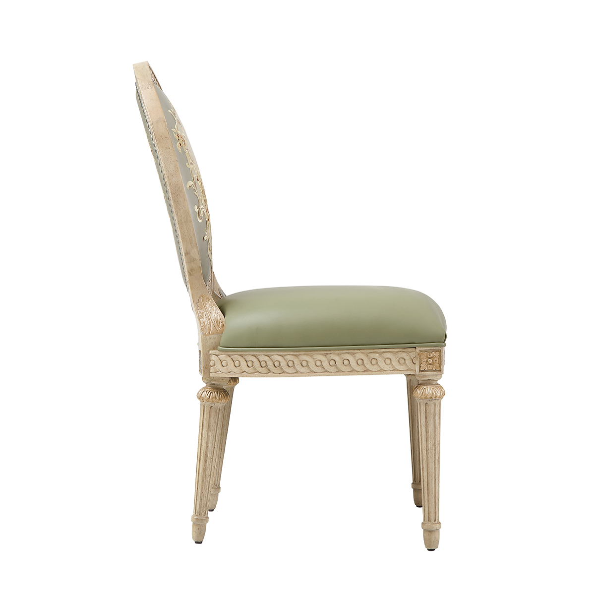 參考18世紀(jì)法國路易十六時期涂金扶手椅古董設(shè)計,并結(jié)合同時期的圓面背板設(shè)計。配上精致的連續(xù)雕刻和貼金鉑工藝、錐形腳設(shè)計、觸感舒適的布藝和包有豐厚的填充物坐墊和靠背。