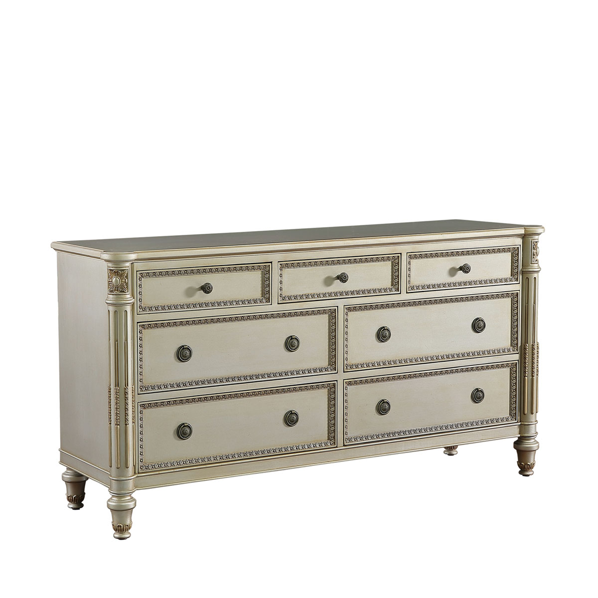 * 為表現法國路易時期的莊嚴和浪漫,以法國凡爾賽宮為設計元素。使用歌頌路易十四時期的太陽花雕刻,顯示其王權穩固地位的錐形腿腳設計,配以鉆石圖案的木皮貼面、古銅色的球形把手和貼金工藝,完美演繹了法式宮廷家具的奢華尊貴。