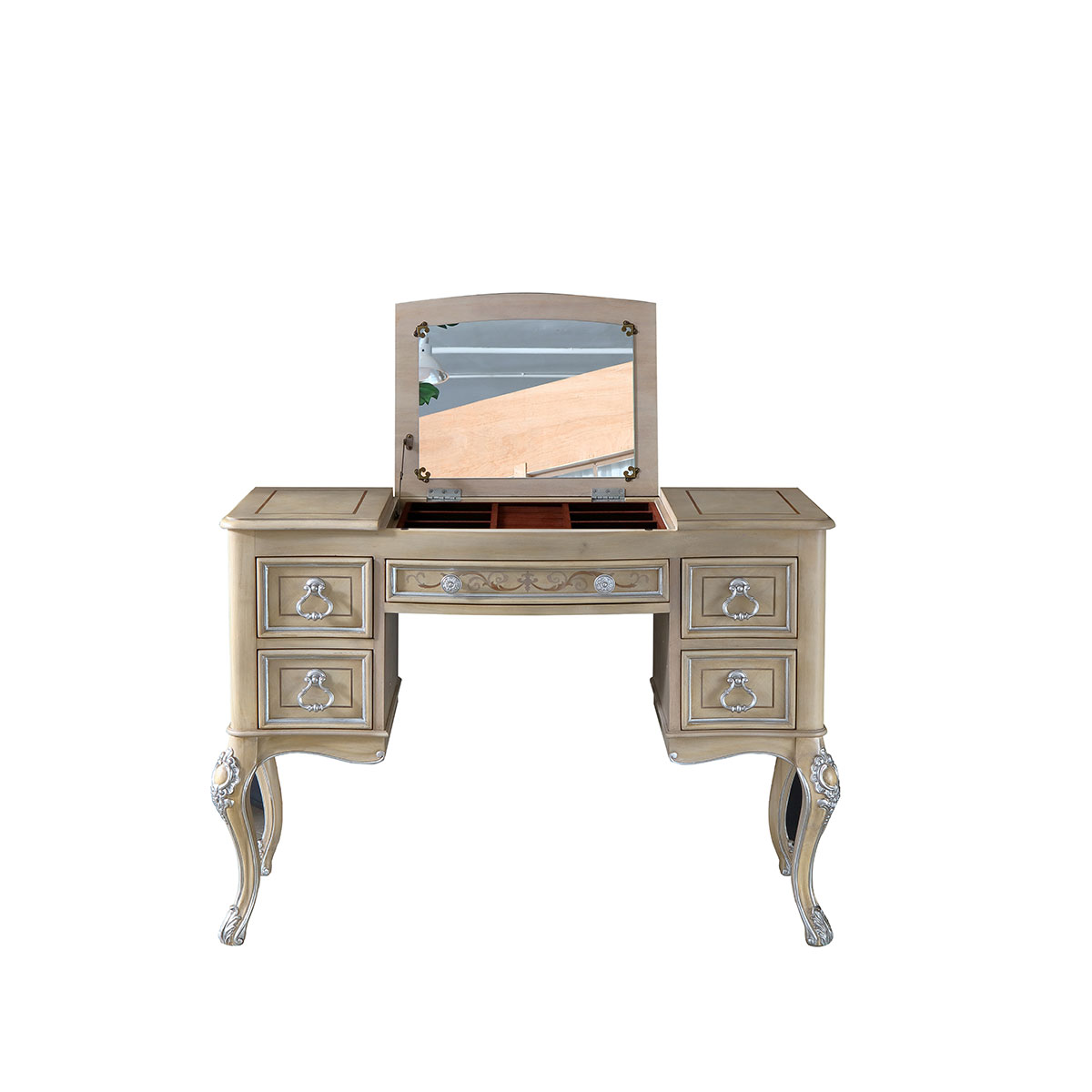 * 四個儲物抽斗,底部采用硬木實木滑軌.中間抽斗的設計可翻下斗面,用來放置鍵盤,抽斗內側有電線孔,抽斗兩邊裝有兩條三節消聲鐵滑軌,滑順耐用; * 中間面板可打開,里面有鏡子和絨布戒指格; * 腳底部裝有可調腳釘
