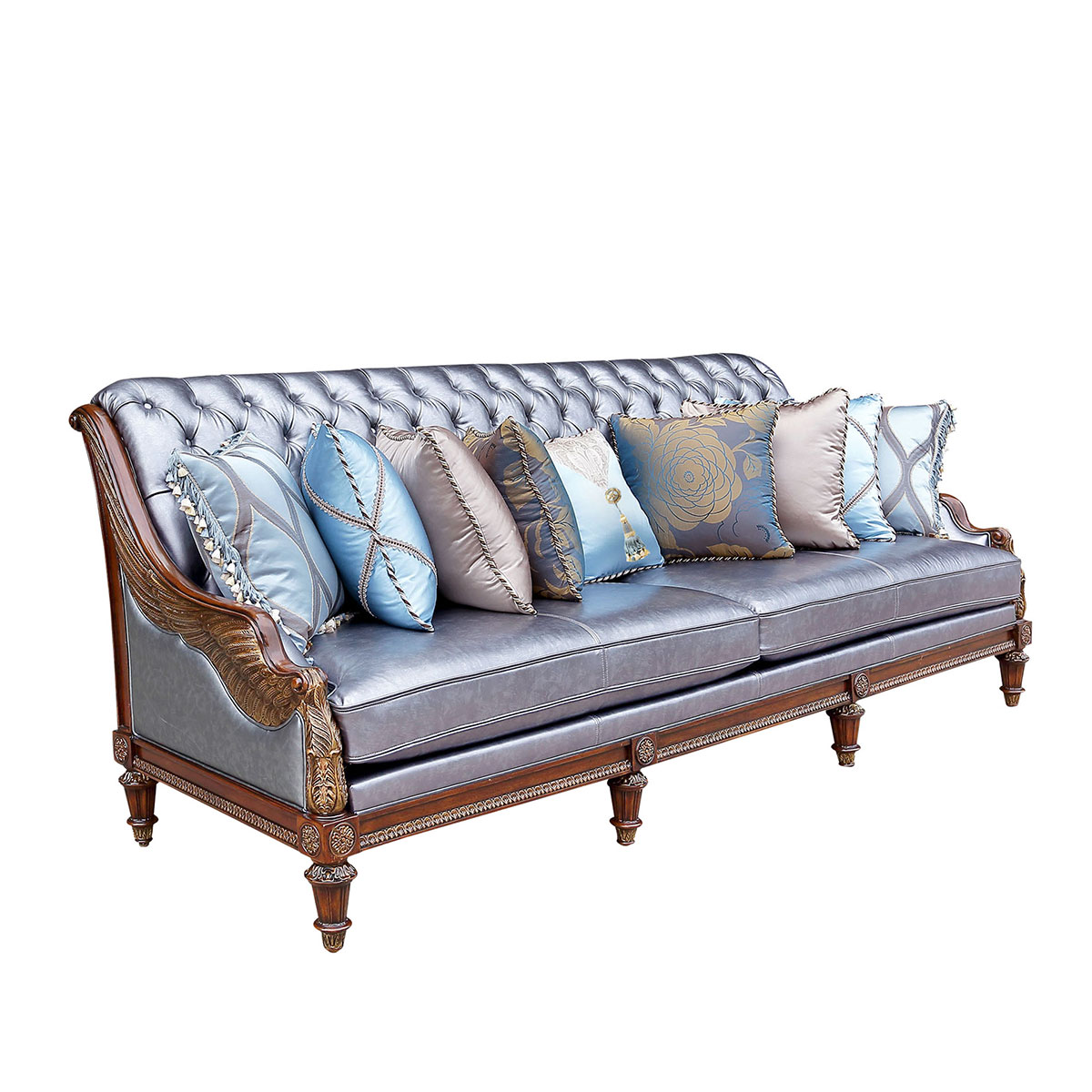 * 本款沙發可選擇四片拆裝(底座、左扶手、右扶手、后背)* 手工雕刻的工藝細節* 細致的拉扣工藝和包有豐厚的填充物坐墊;* 標配抱枕:500*500 6個 430*430 1個* 提供多種面料可供選擇;