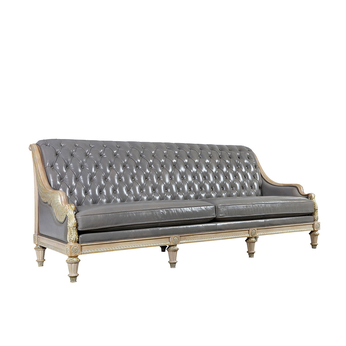 魅影灰邂逅灰褐色,皮質珍奢而不失大氣之姿;設計雕刻出勝利女神-Samothrace翅膀扶手,羽翼豐滿的羽毛雕刻極為精巧經典,援引古典常用的色彩,以簡飾繁;錯落有序的條紋回路蘊藏著達•芬奇的繪畫創作靈感,拉斐爾的建筑設計妙思以及米開朗基羅的雕塑精粹。