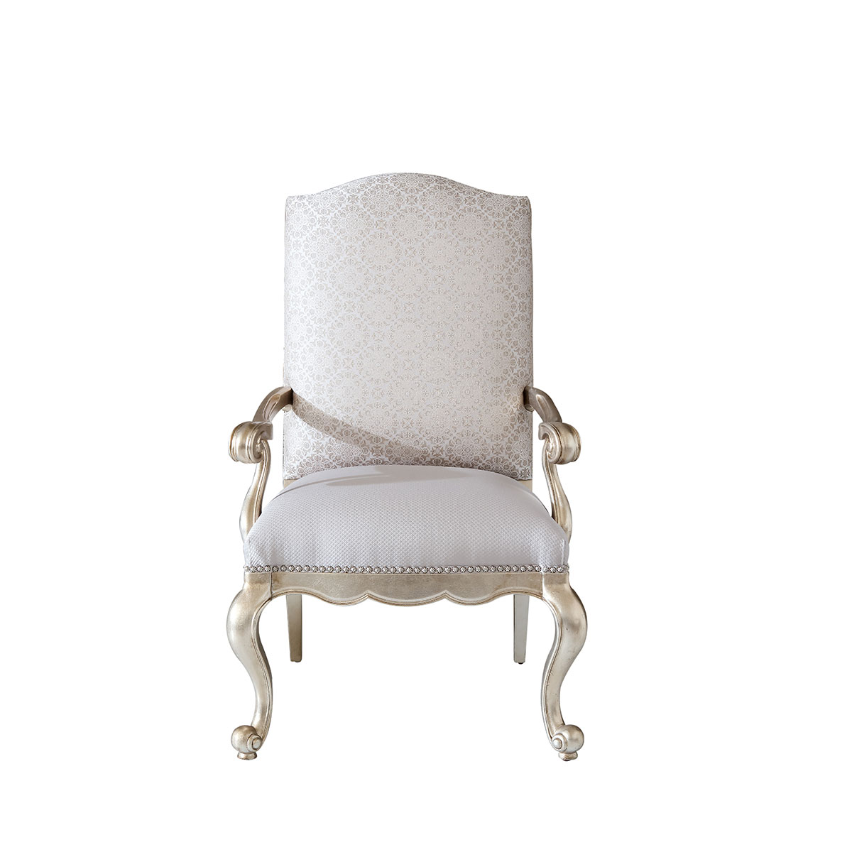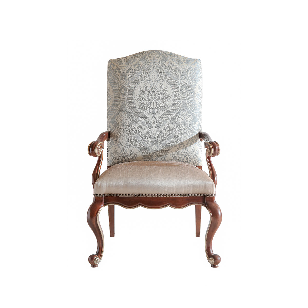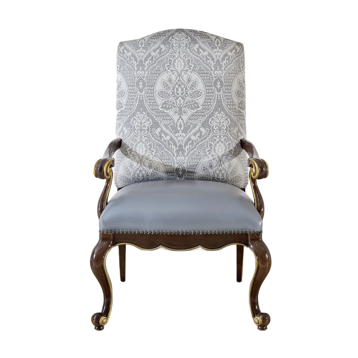 * 一款集合法式元素包括Camelback Silhouette(駝峰輪廓)造型、旋渦形扶手和S形彎腳的高背休閑椅,并配上觸感舒適的布藝和包有豐厚的填充物坐墊和靠背;