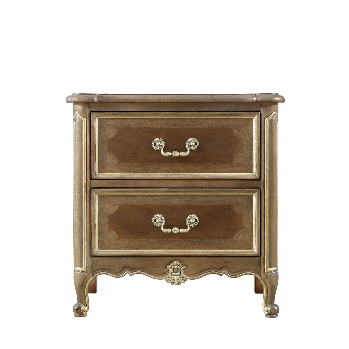"* 手工拼花藤蔓效果,用多種上等木皮拼制而成 * 二個儲物斗,底部采用經(jīng)典的硬木實木滑軌; * 腳腳底部裝有可調(diào)腳釘;"