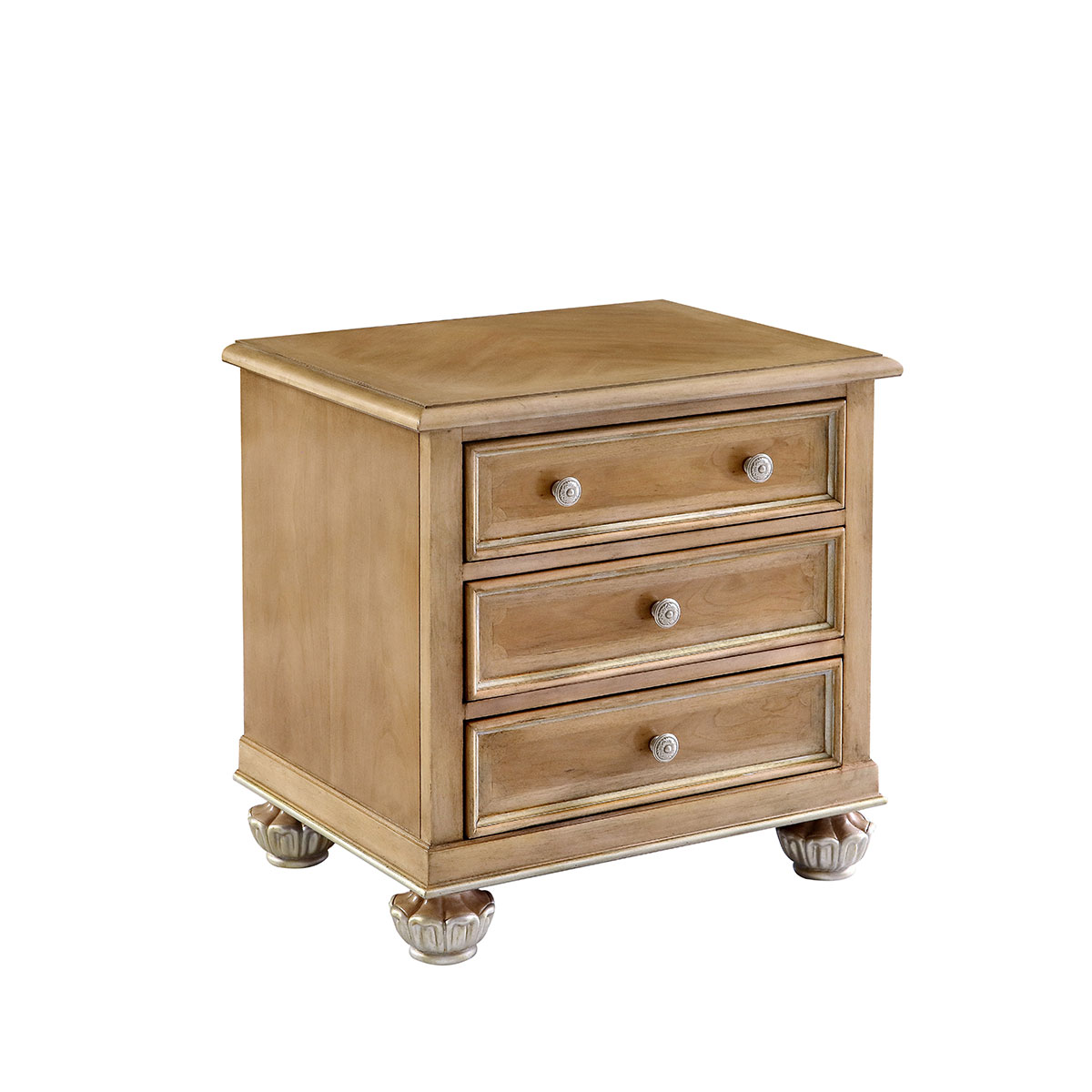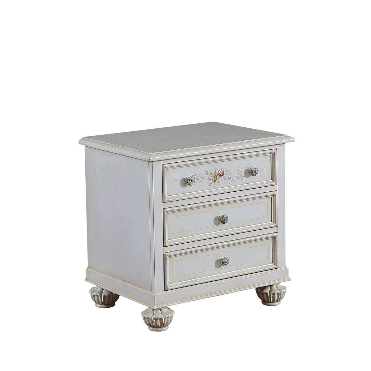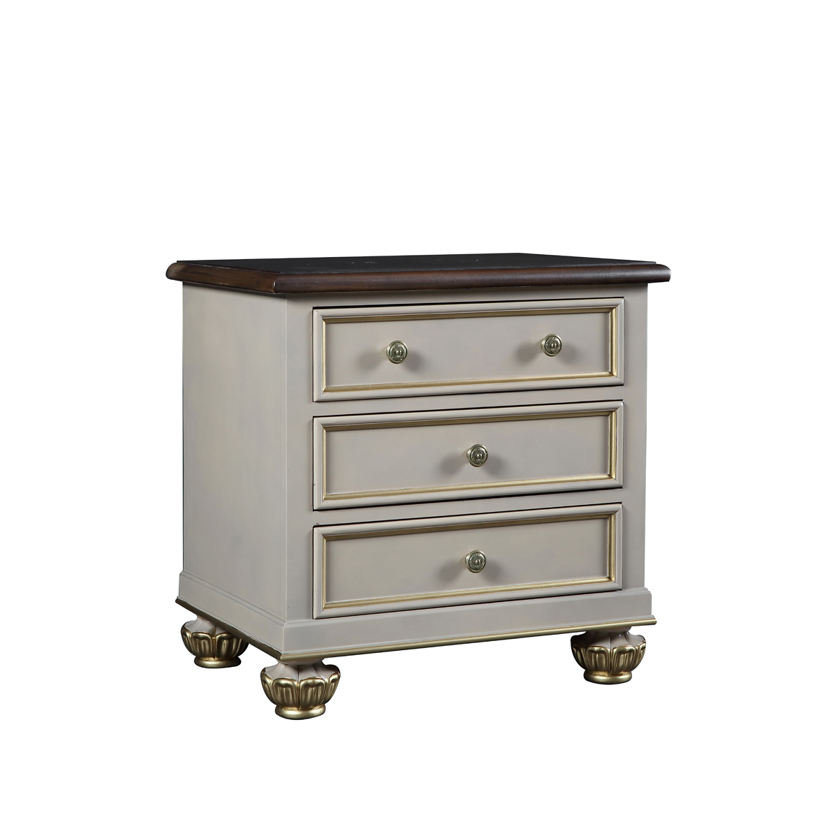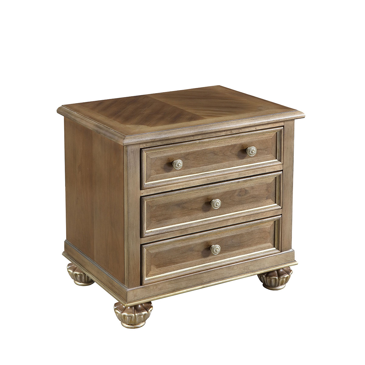 * 手工拼花藤蔓效果,用多種上等木皮拼制而成 * 三個儲物斗,底部采用經典的硬木實木滑軌; * 腳腳底部裝有可調腳釘;