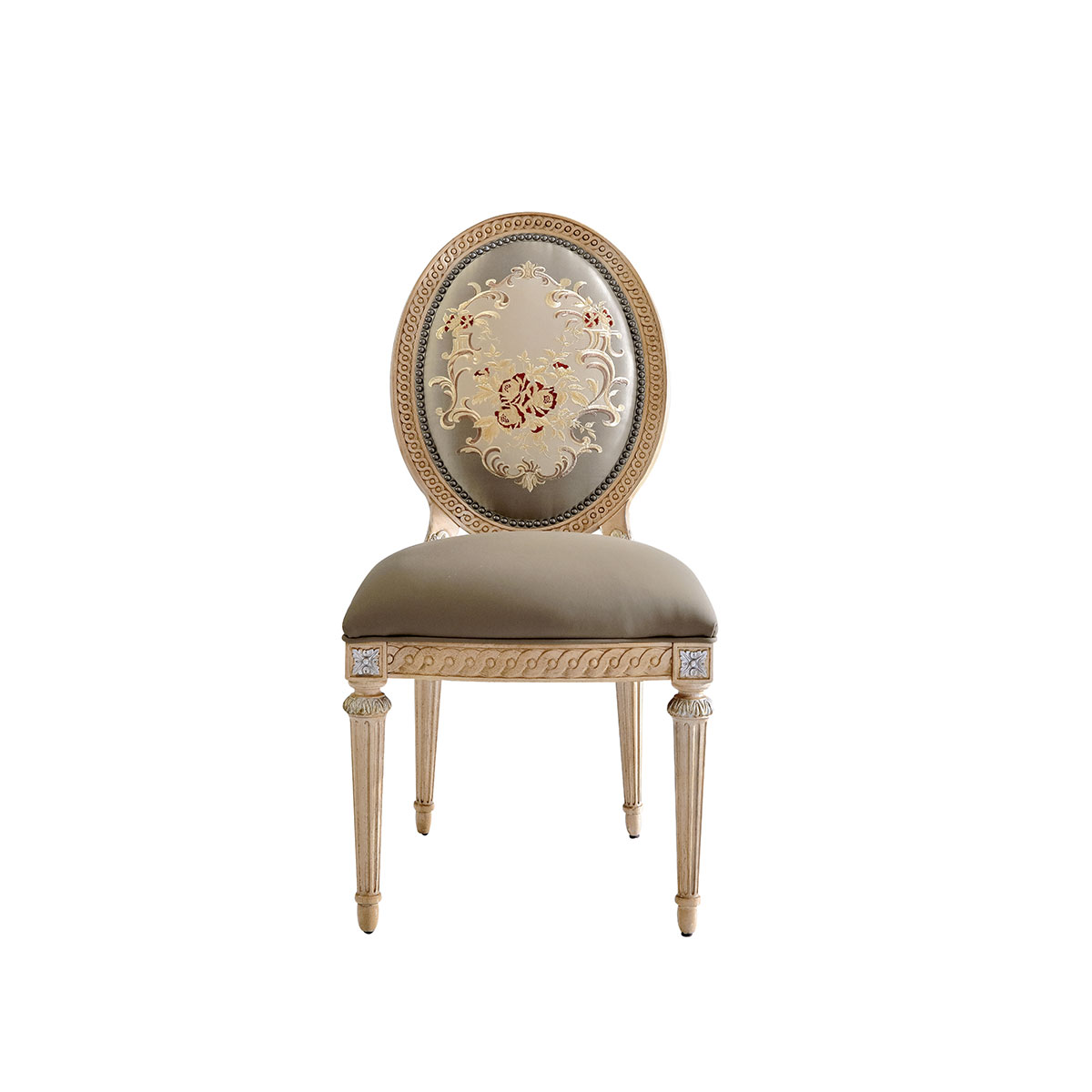 參考18世紀法國路易十六時期涂金扶手椅古董設計,并結合同時期的圓面背板設計。配上精致的連續雕刻和貼金鉑工藝、錐形腳設計、觸感舒適的布藝和包有豐厚的填充物坐墊和靠背。