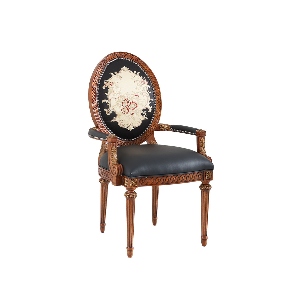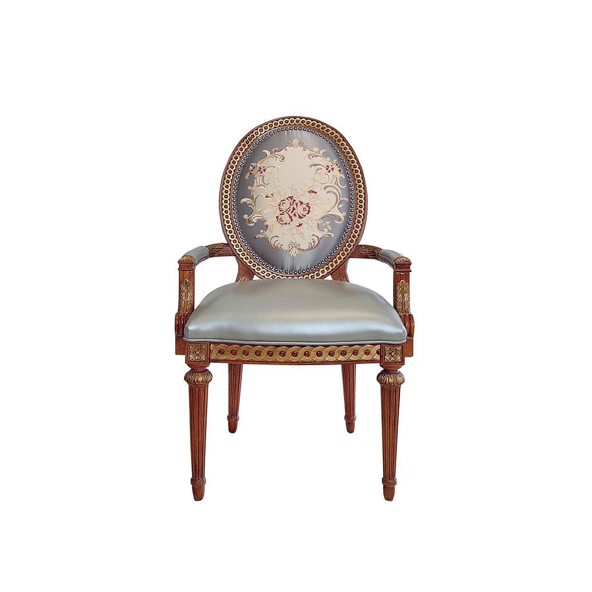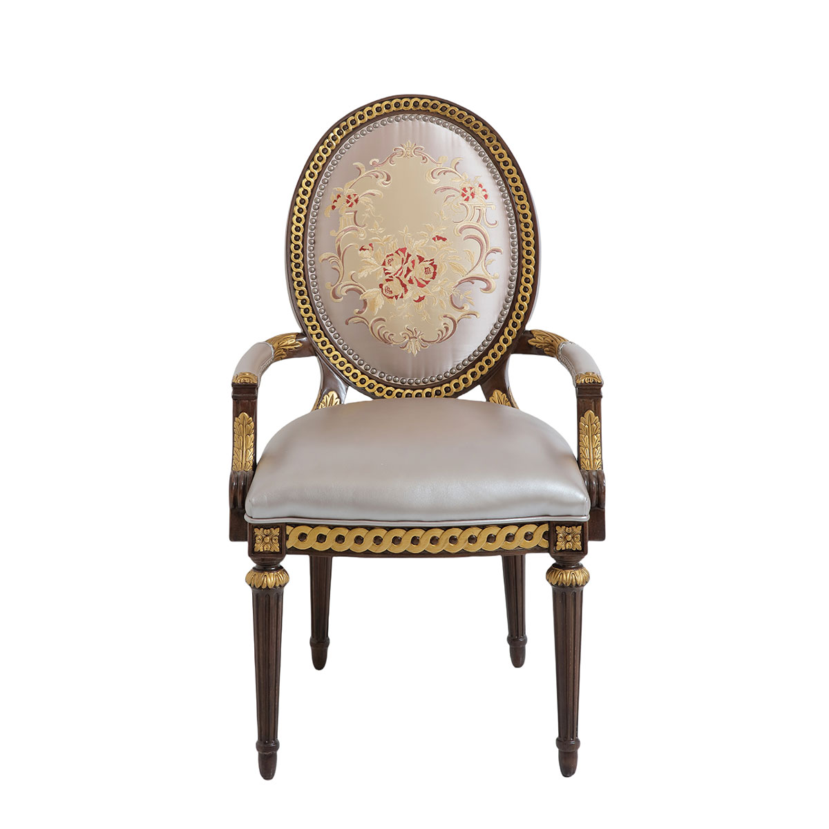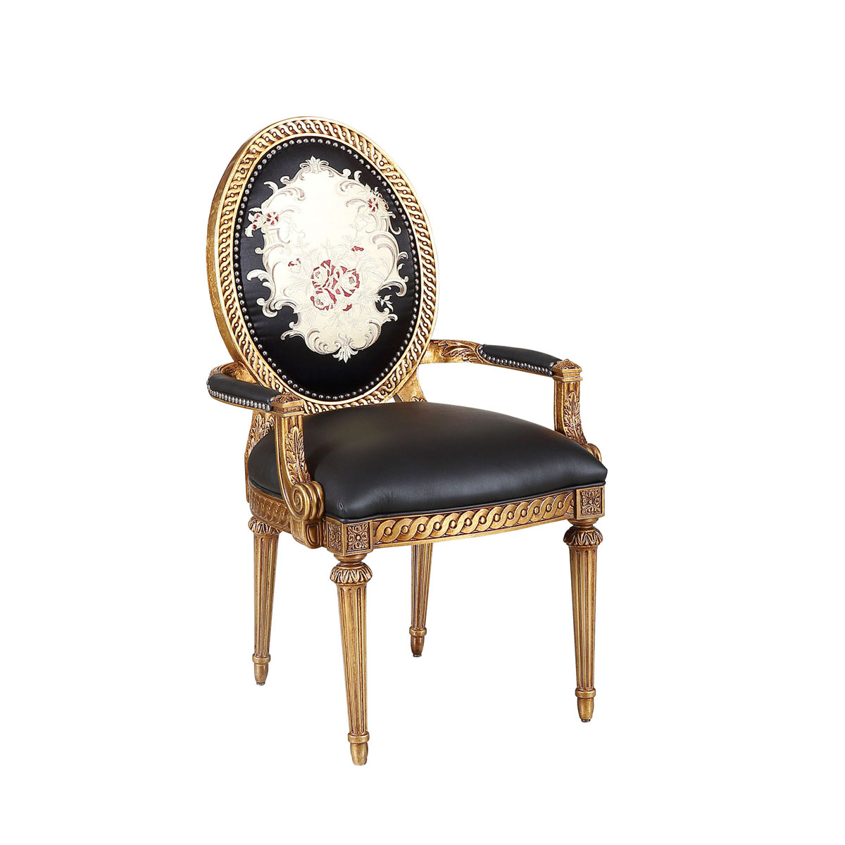 參考18世紀法國路易十六時期涂金扶手椅古董設計,并結合同時期的圓面背板設計。配上精致的連續(xù)雕刻和貼金鉑工藝、錐形腳設計、觸感舒適的布藝和包有豐厚的填充物坐墊和靠背。