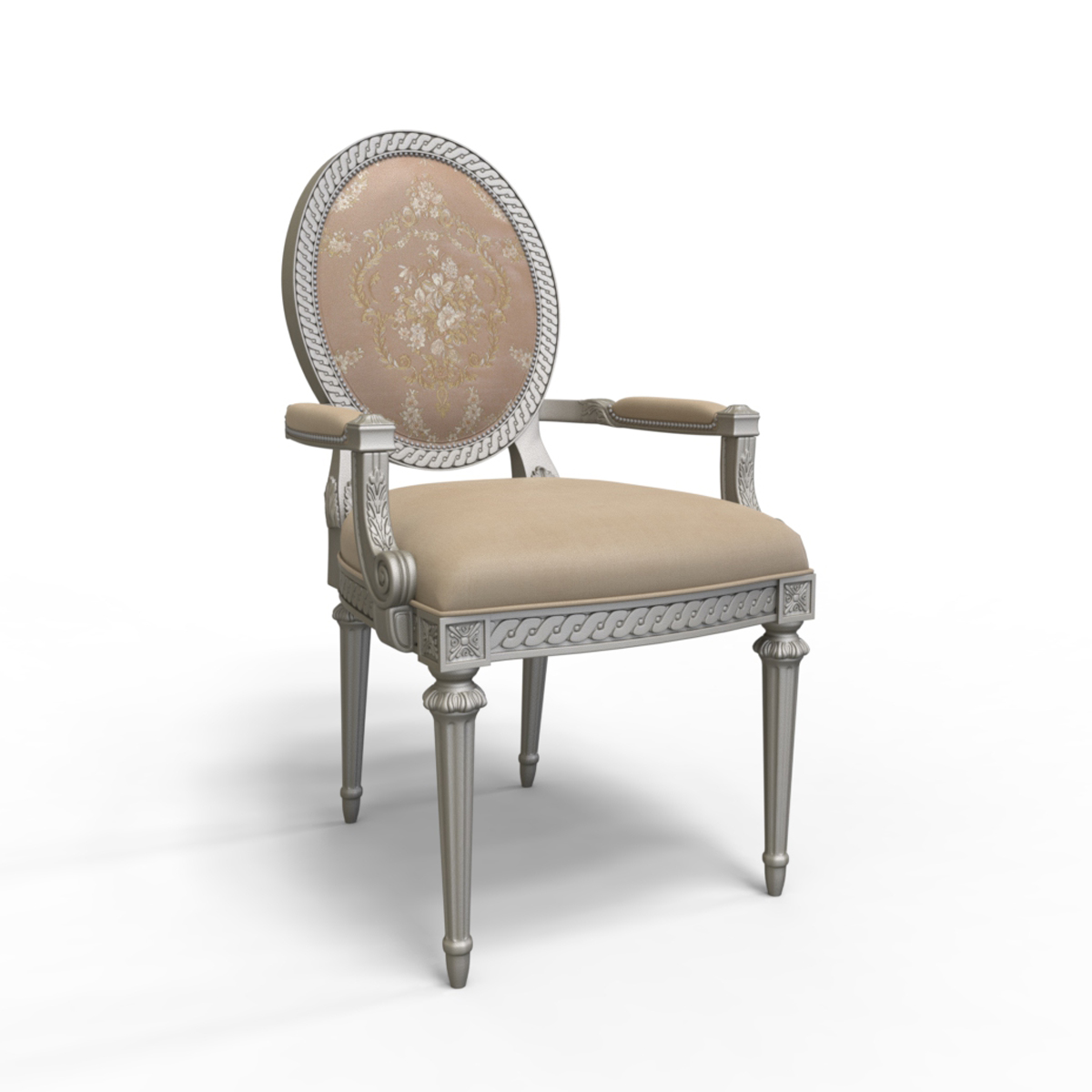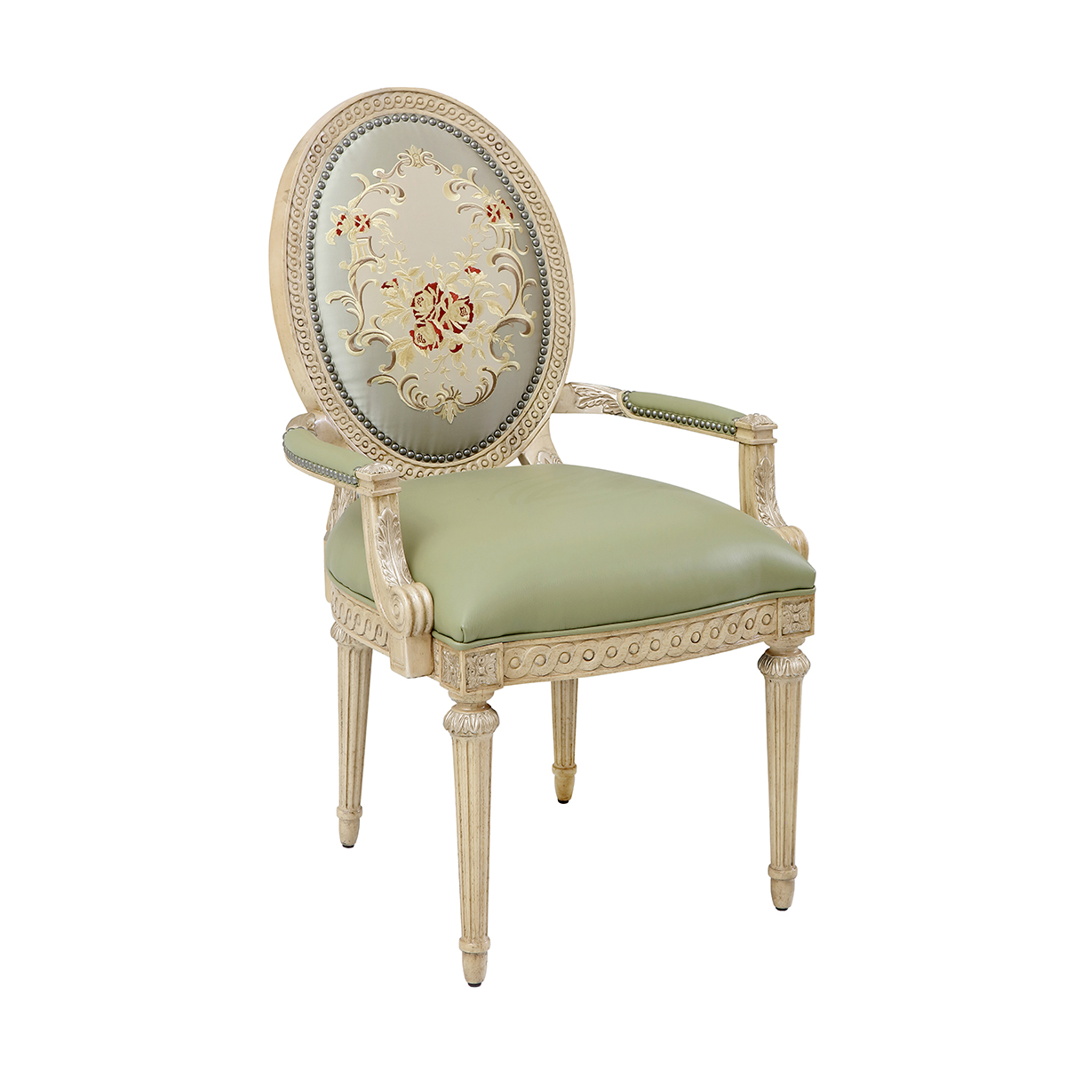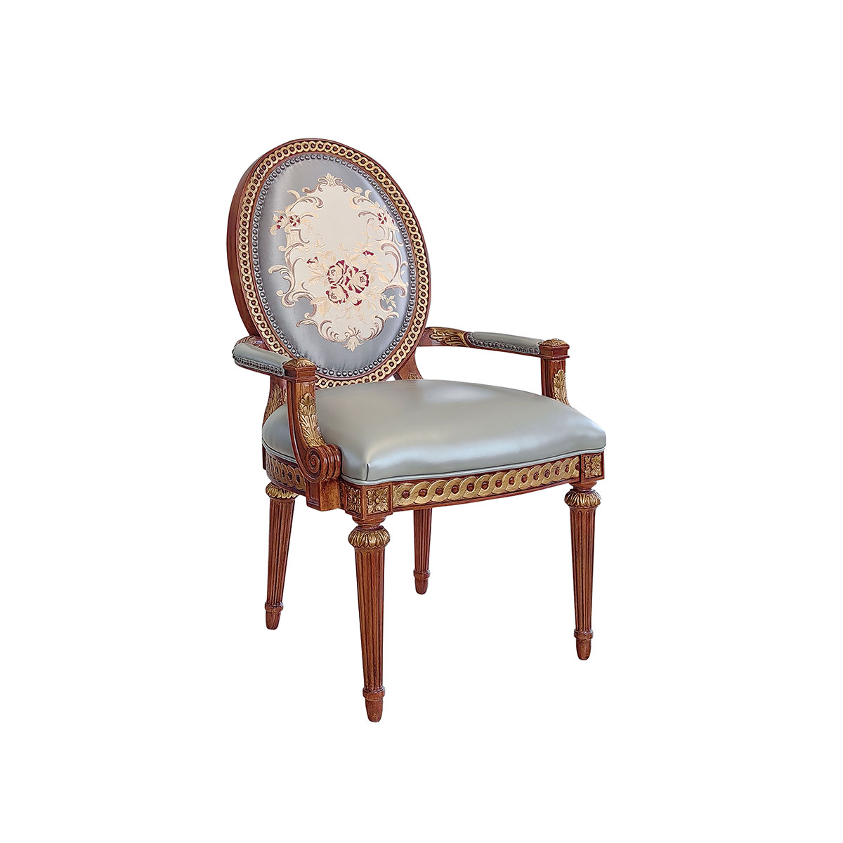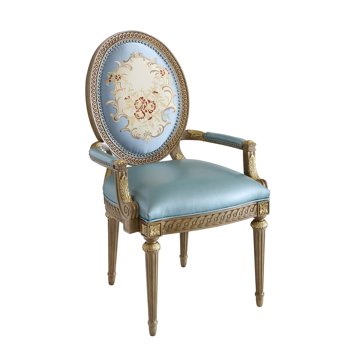 參考18世紀法國路易十六時期涂金扶手椅古董設計,并結合同時期的圓面背板設計。配上精致的連續(xù)雕刻和貼金鉑工藝、錐形腳設計、觸感舒適的布藝和包有豐厚的填充物坐墊和靠背。