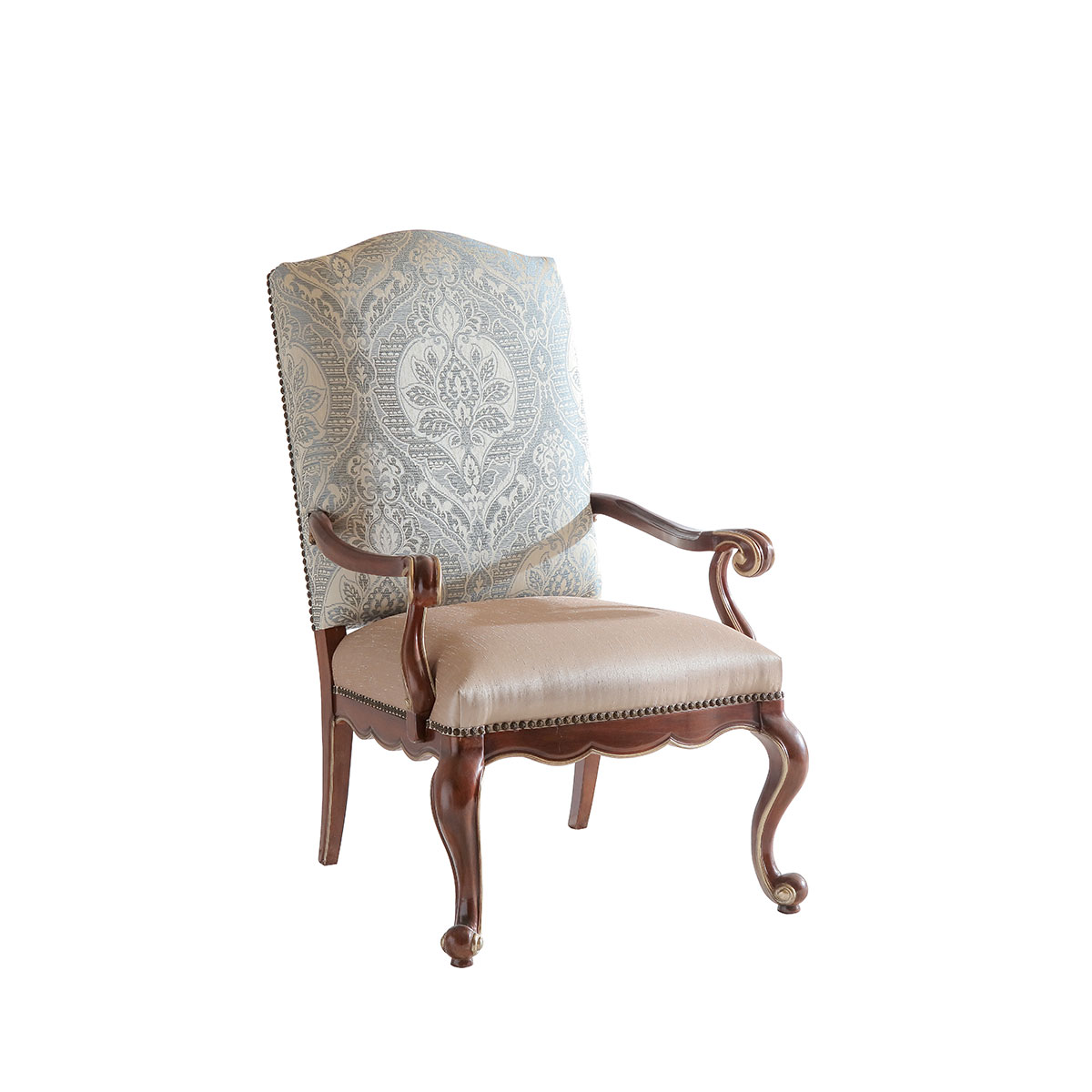 一款集合法式元素包括Camelback Silhouette(駝峰輪廓)造型、旋渦形扶手和S形彎腳的高背休閑椅,并配上觸感舒適的布藝和包有豐厚的填充物坐墊和靠背。