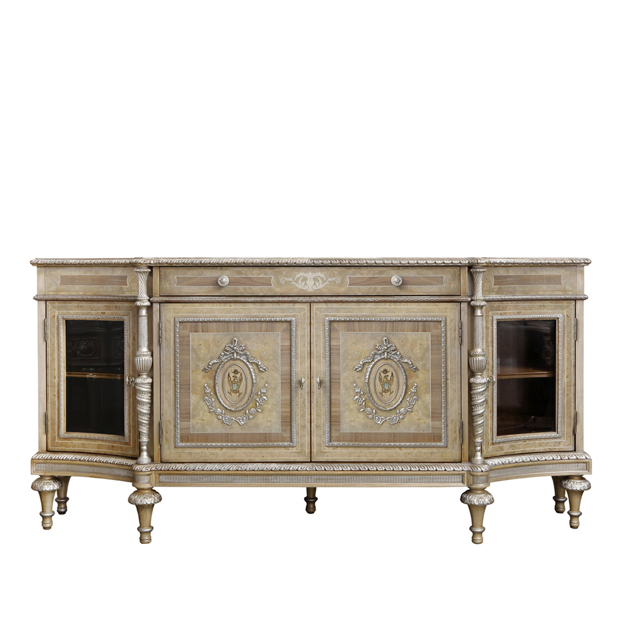 * 精致的手工雕刻細(xì)節(jié)和貼金工藝; * 一個(gè)儲(chǔ)物抽斗,底部采用硬木實(shí)木滑軌; * 左右兩邊為實(shí)木框玻璃門,四扇門內(nèi)各有一塊可調(diào)層板; * 腳底部裝有可調(diào)腳釘;