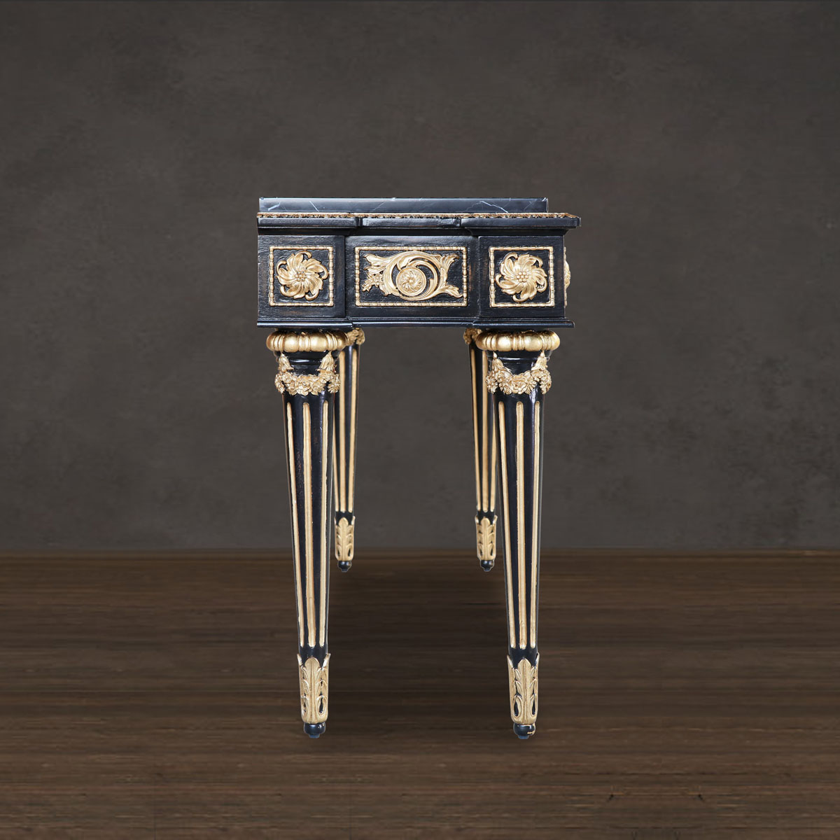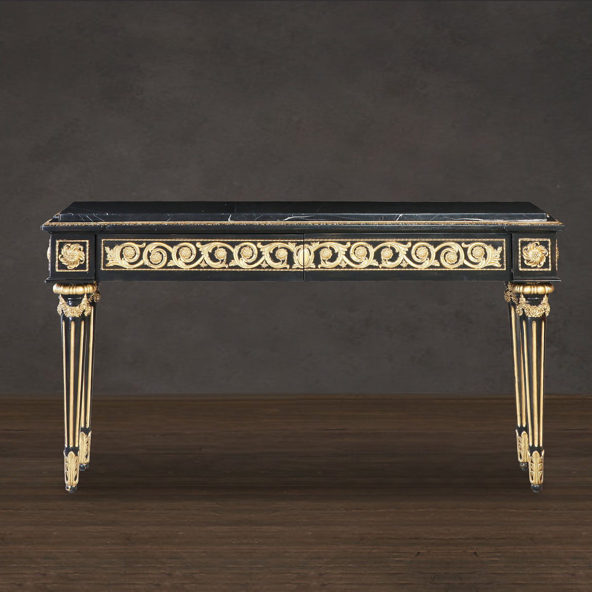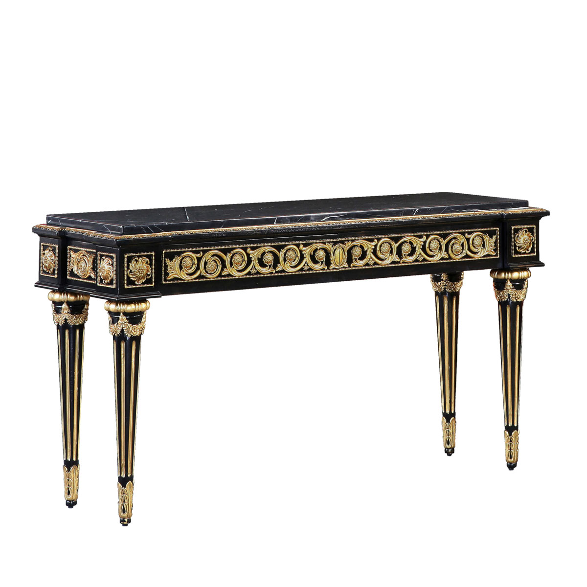 * 這是設(shè)計意念來自于英國溫莎堡中喬治三世時期的走廊桌,是新古典主義風(fēng)格的早期作品,從腿到裝飾花紋都采用了對稱形式,飾以帶凹槽的古羅馬柱式設(shè)計,讓整件家件透露出尊貴優(yōu)雅的藝術(shù)風(fēng)格。搭配古典奢華的黑底金箔設(shè)計與精致的手工雕刻細(xì)節(jié),更顯英國皇室的莊嚴(yán)和高貴。