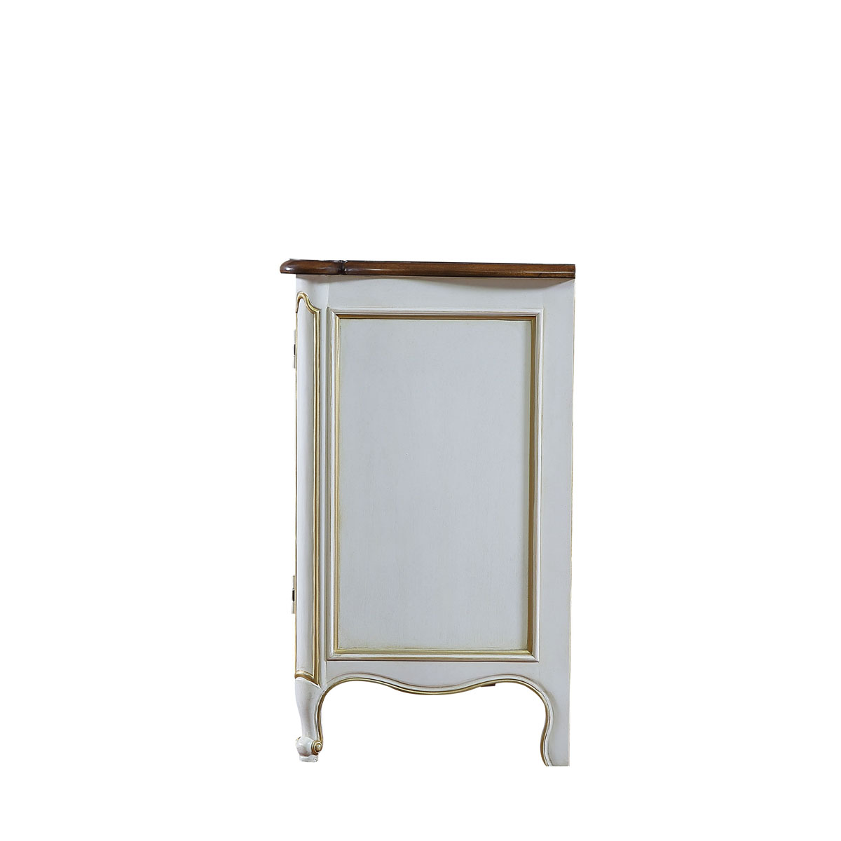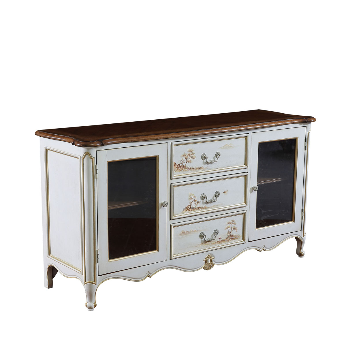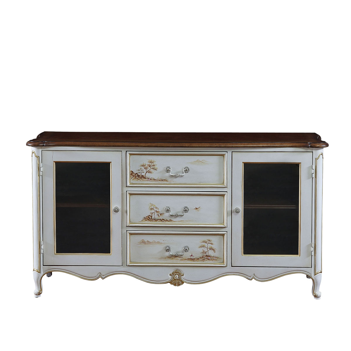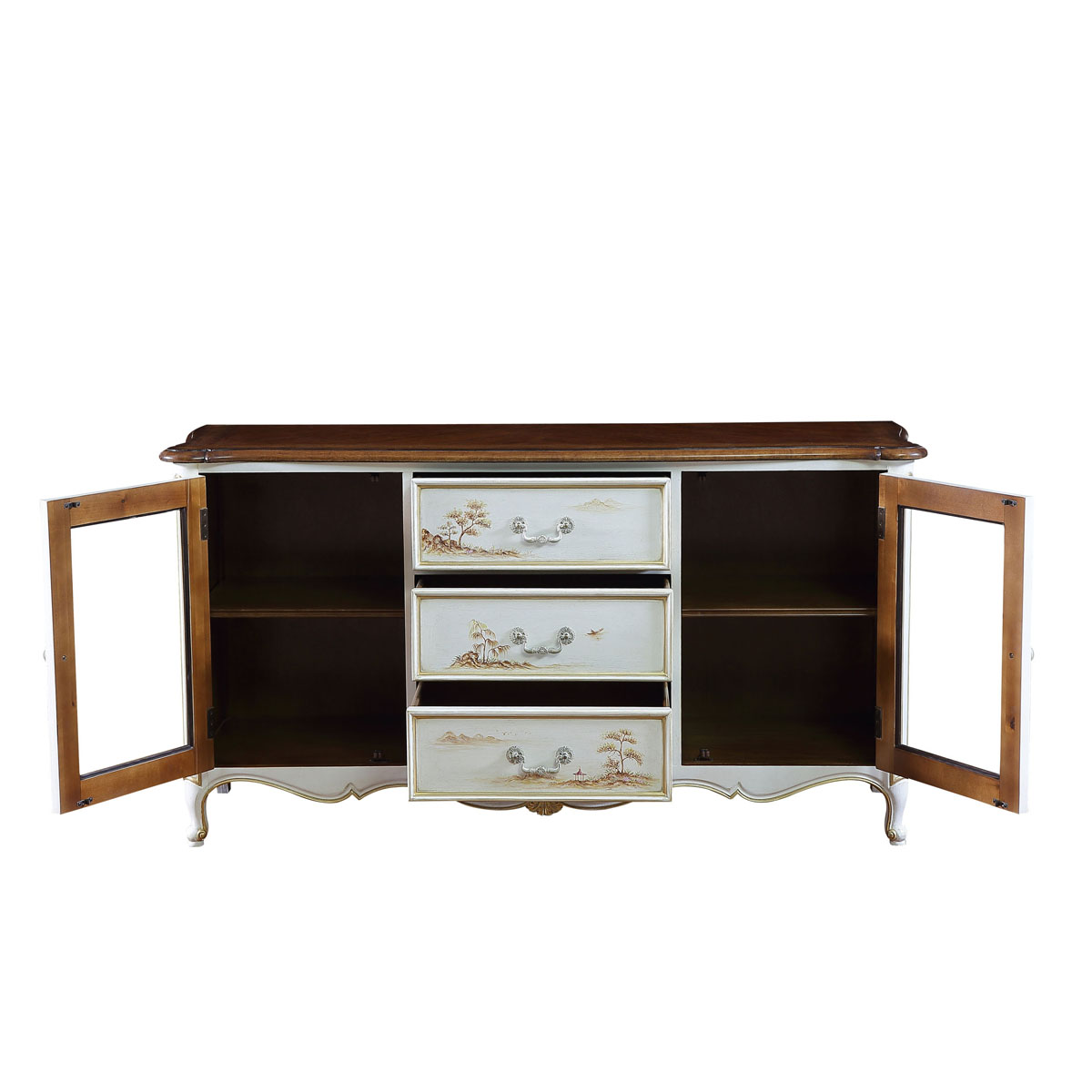 * 在法式仿古白漆上,手繪上意境深遠(yuǎn)的中國風(fēng)山水畫,古銅色與白色形成強(qiáng)烈的對比,盡顯法國貴族休閑典雅的生活品位;銀漆的金屬拉扣與金漆的圍邊飾框,相映生輝,演繹低調(diào)的優(yōu)雅與奢華。