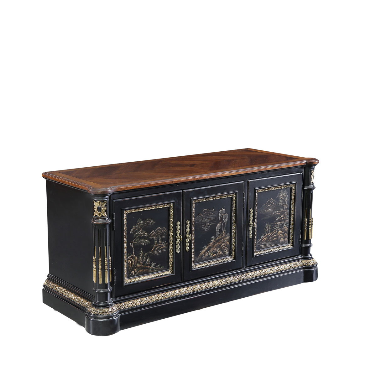 * 為表現法國路易時期的莊嚴和浪漫,以法國凡爾賽宮為設計元素。使用歌頌路易十四時期的太陽花雕刻,優雅的黑金色手繪山水畫與鉆石圖案實木薄片拼貼工藝,完美演繹了法式宮廷家具的奢華尊貴。