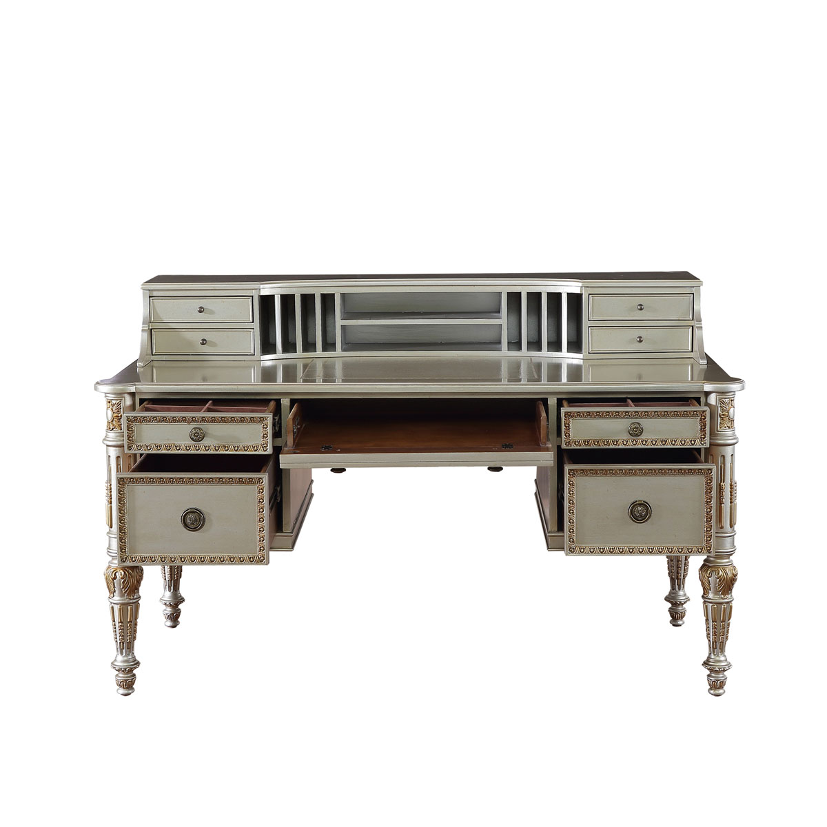 * 女主人關于美的秘密,或許只有梳妝臺知道。卷葉植物與直線凹槽裝飾的錐形腳,象征著皇室的卓越品味;華麗金箔貼飾和鉆石形拼花圖案,傳遞出奢華浪漫的專屬風格;而豐富的小抽屜與層格設計,則用實用功能向玲瑯滿目的化妝品與珍寶首飾致敬.