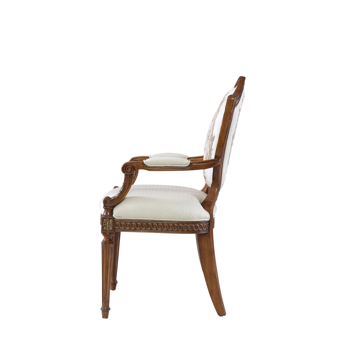 法國(guó)新古典和洛可可風(fēng)格,盾型椅背造型簡(jiǎn)約大方,建筑柱雕刻柱腿簡(jiǎn)約的直線條造型,端莊大氣,采用印花布藝,非常有田園風(fēng)的感覺(jué)。