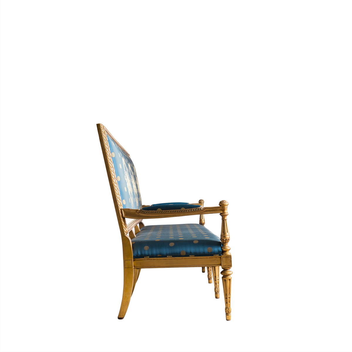 * 這是以美國白宮的Blue Room(藍色房間) 為意念并結合法國元素而設計的沙發。包括建筑雕刻錐形腳、 權杖狀的扶手柱、葉形雕刻外框和貼金鉑工藝,配上代表自由的藍色布藝和包有豐厚的填充物坐墊和靠背。