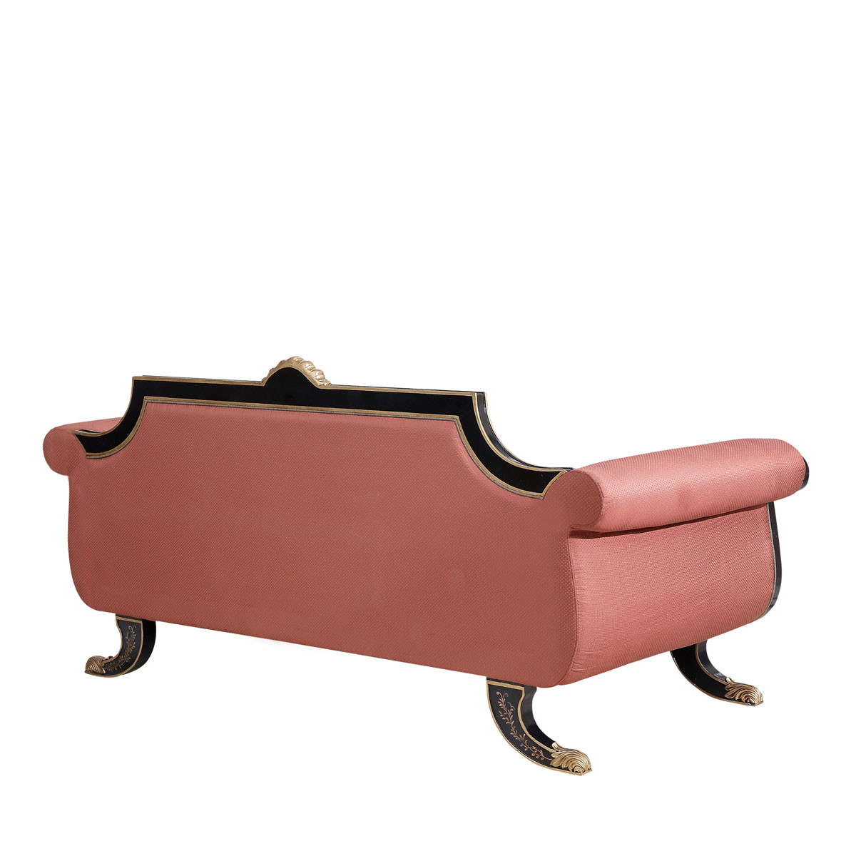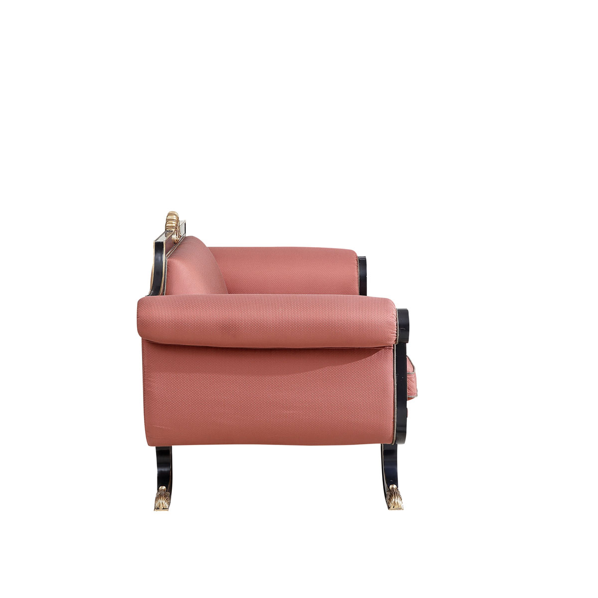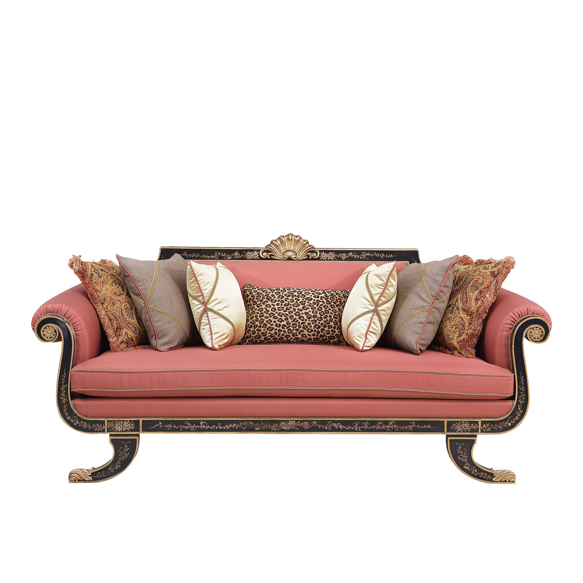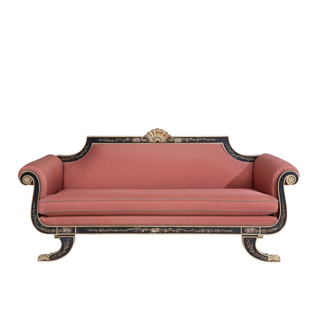 沙發(fā)采用五月花號(hào)輪船的造型,兩卷軸扶手向外翻轉(zhuǎn),纖細(xì)的四個(gè)彎腿支撐,粗中有細(xì),體現(xiàn)出航海的自由與勇敢,紅色的面料配黑色手繪的邊框,典型的中西文化合壁,典雅穩(wěn)重又倍顯多元文化的交匯融合。