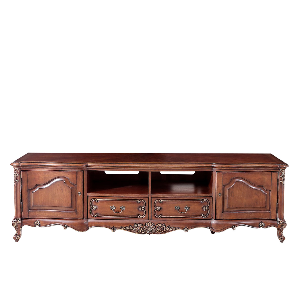 * 手工雕刻的花圃、藤蔓、阿坎瑟斯卷葉圖案和彎腳設計 * 結實的連接技術 * 兩個儲物抽斗并配有CD/DVD隔板,而在其底部采用經典硬木實木滑軌設計;門內配有可調層板