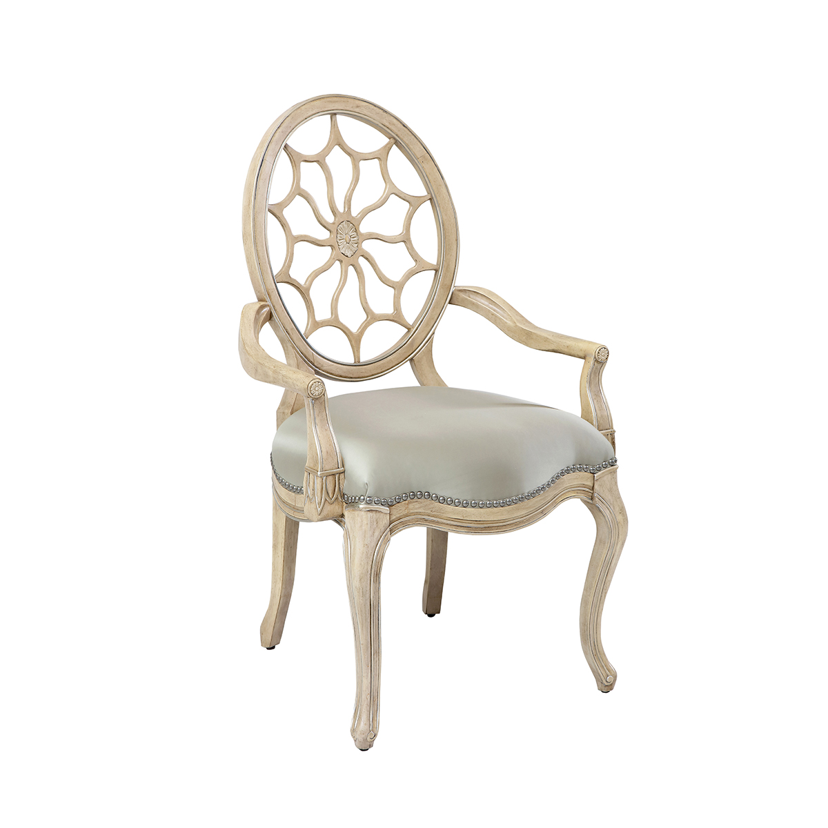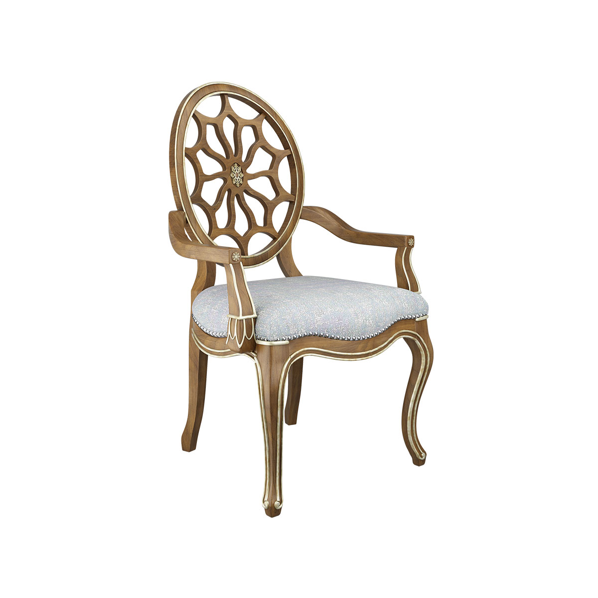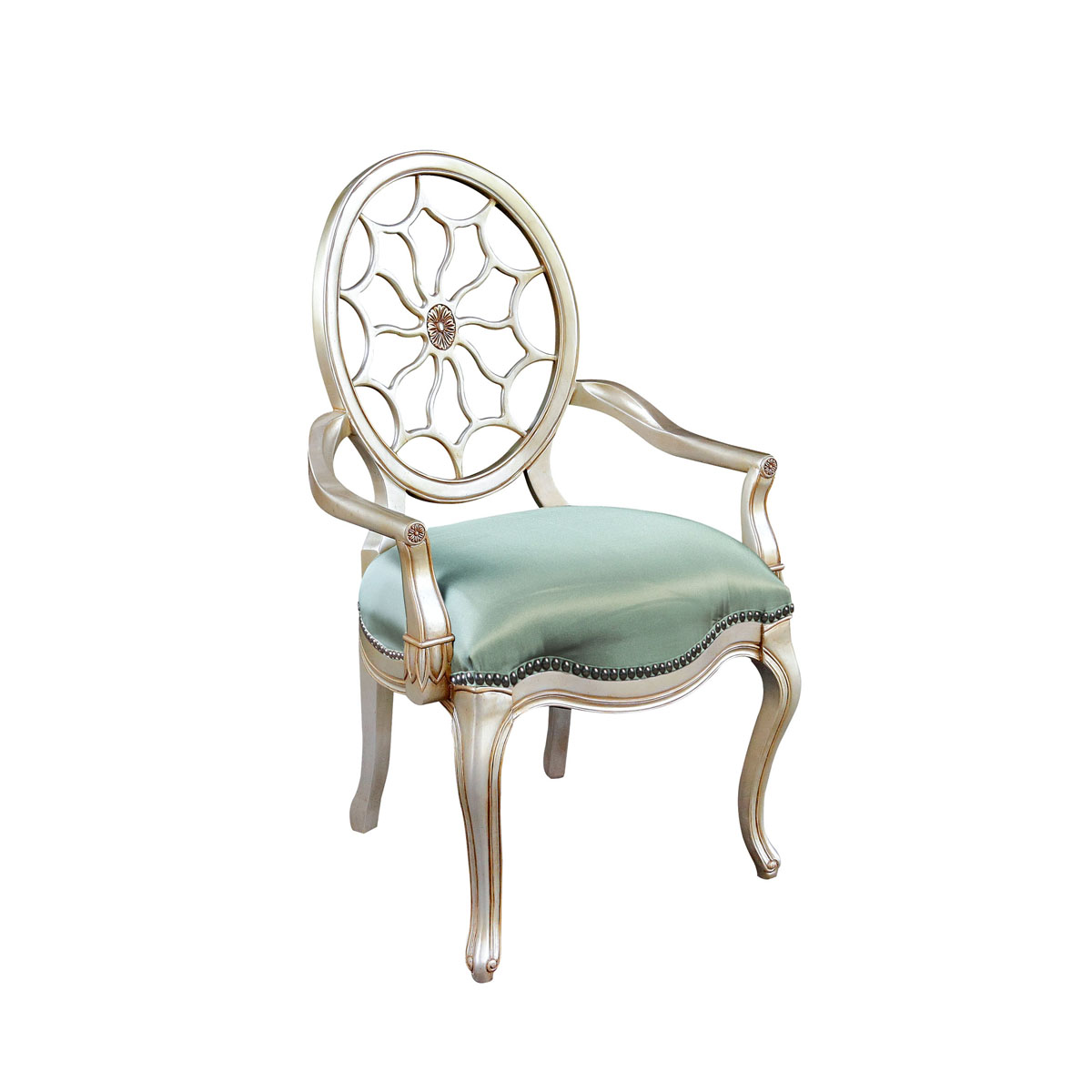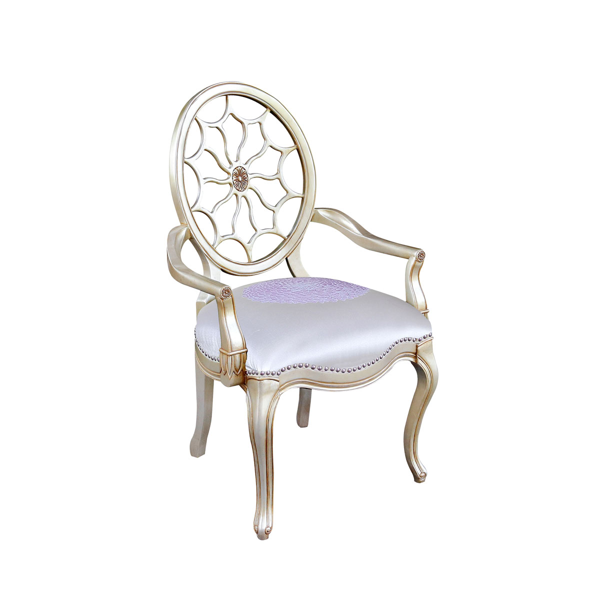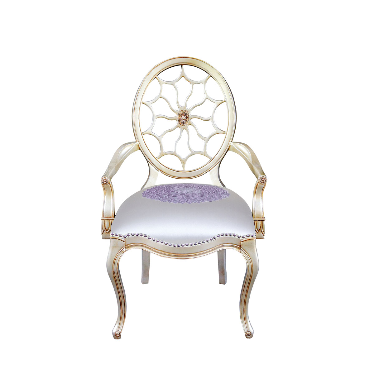* 參考喬治三世時期的古董造型設(shè)計,使用輪子構(gòu)造椅背和安妮王后腿,配以精致的手工雕刻細節(jié)和涂金工藝、布藝面料和厚實柔軟的填充物,是豪華系列凡爾賽玫瑰法式扶手椅的特色。