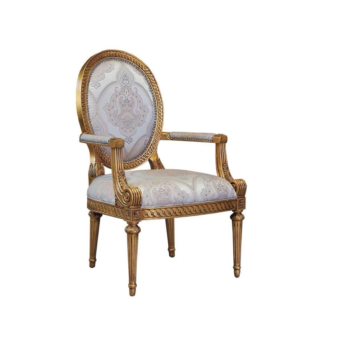 這款休閑椅是參考18世紀(jì)法國(guó)路易十六時(shí)期涂金扶手椅古董設(shè)計(jì),并結(jié)合同時(shí)期的圓面背板設(shè)計(jì)。配上精致的連續(xù)雕刻和貼金鉑工藝、錐形腳設(shè)計(jì)、觸感舒適的布藝和包有豐厚的填充物坐墊和靠背。