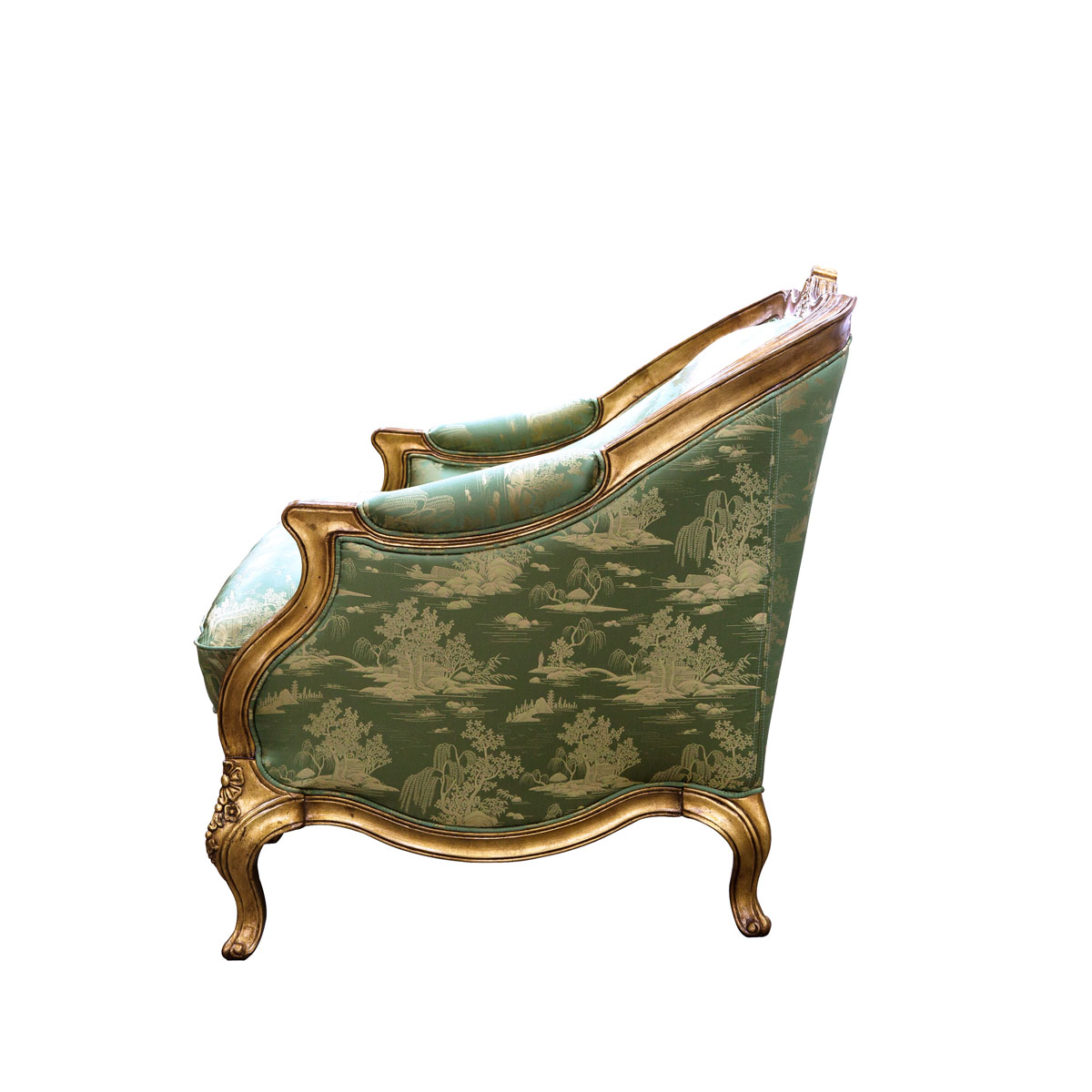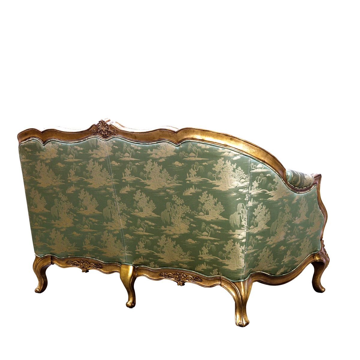 * 從法國十八世紀(jì)初攝政時(shí)期的風(fēng)格中汲取靈感制作而成,采用了同風(fēng)格的彎腳設(shè)計(jì),阿坎瑟斯葉雕刻造型和金箔貼飾,再飾以中國山水圖案的絲綢和包有豐厚的填充物坐墊和靠背,使得這款沙發(fā)閃耀著華麗高貴的光環(huán);