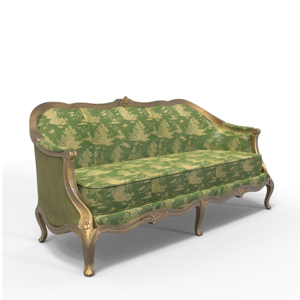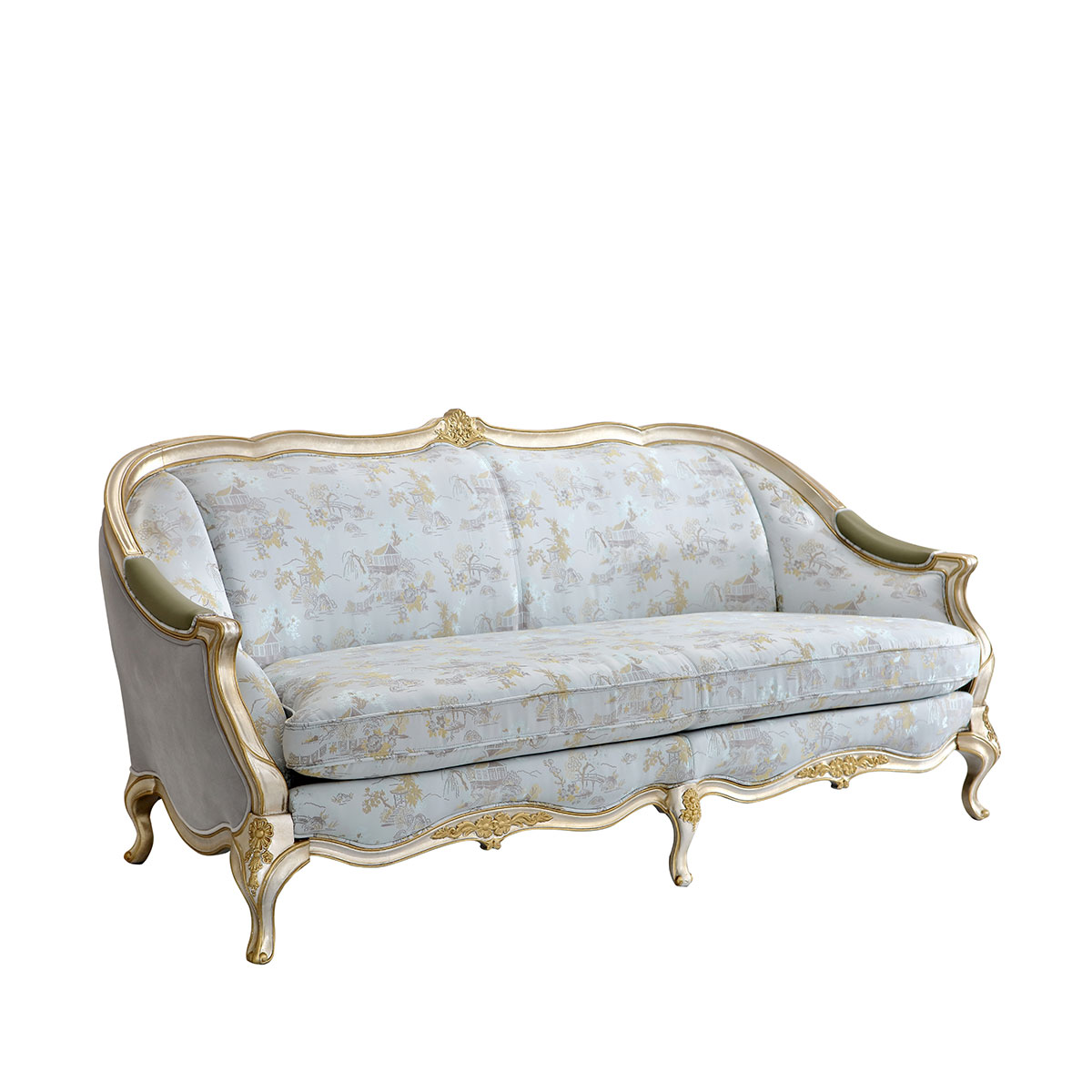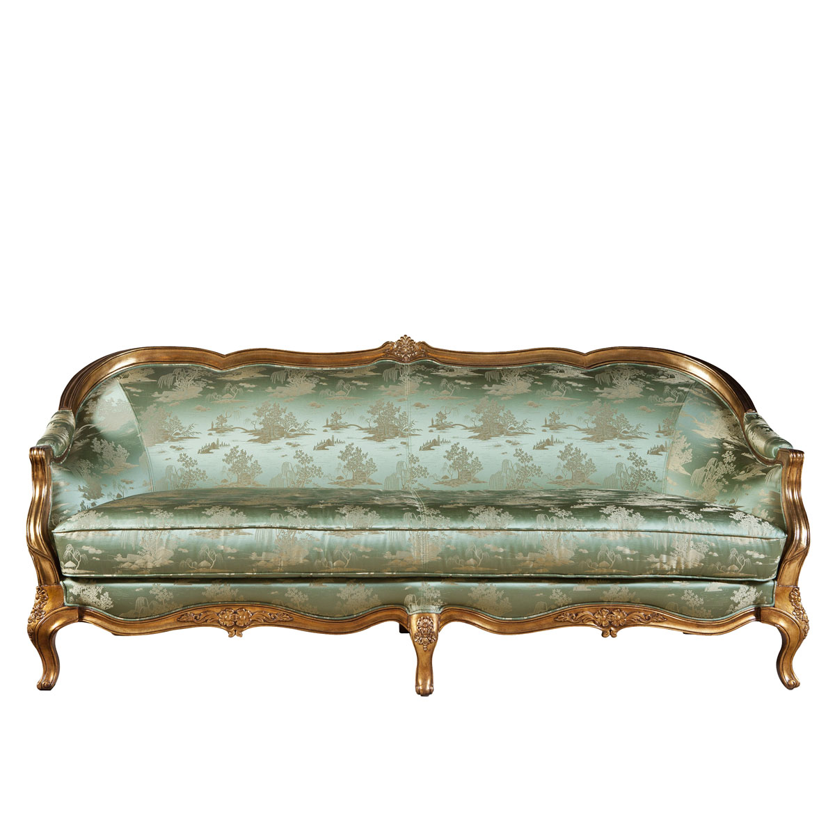 * 從法國十八世紀初攝政時期的風(fēng)格中汲取靈感制作而成,采用了同風(fēng)格的彎腳設(shè)計,阿坎瑟斯葉雕刻造型和金箔貼飾,再飾以中國山水圖案的絲綢和包有豐厚的填充物坐墊和靠背,使得這款沙發(fā)閃耀著華麗高貴的光環(huán);