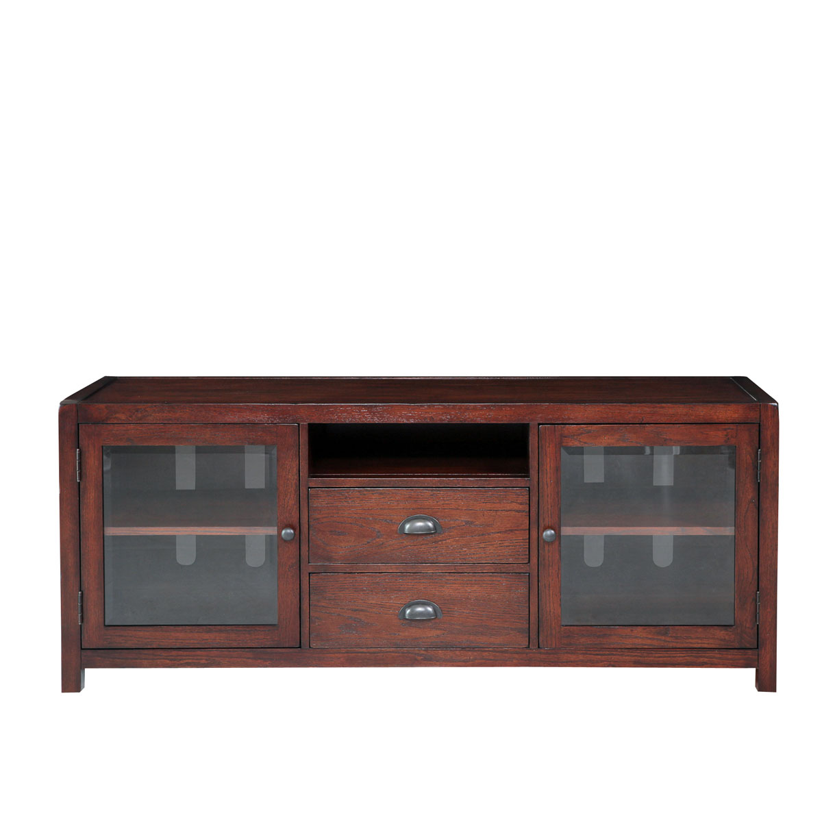 * 中間兩個儲物抽斗,其底部采用鐵路軌可以將CD和DVD碟更好分類存放 * 左右兩邊為實木框玻璃門,門內有一塊可調木層板
