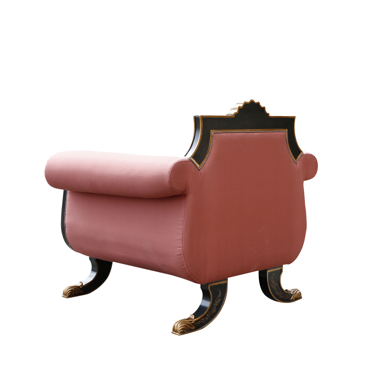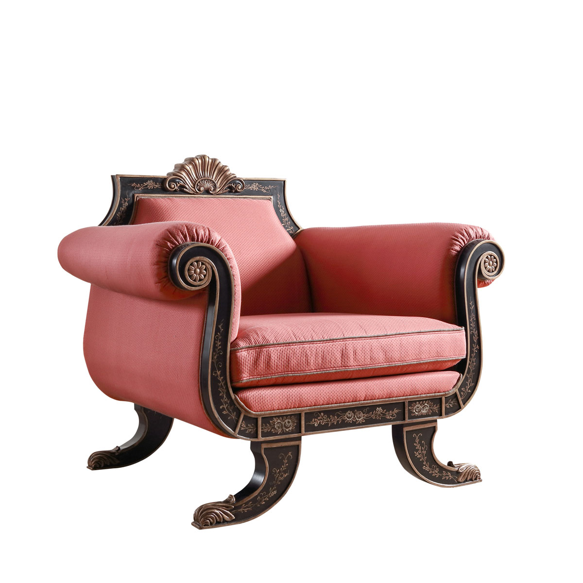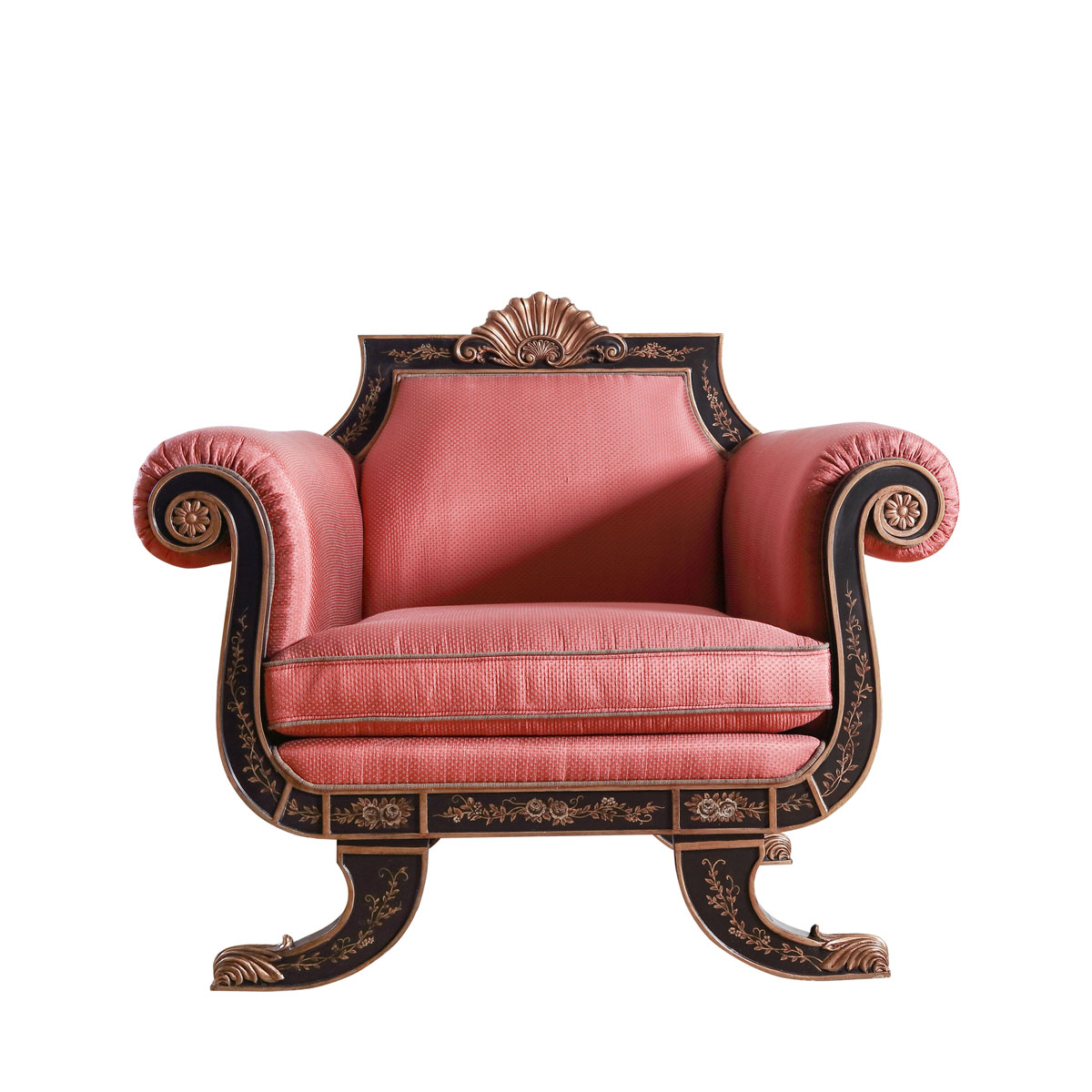 沙發(fā)采用五月花號(hào)輪船的造型,兩卷軸扶手向外翻轉(zhuǎn),纖細(xì)的四個(gè)彎腿支撐,粗中有細(xì),體現(xiàn)出航海的自由與勇敢,紅色的面料配黑色手繪的邊框,典型的中西文化合壁,典雅穩(wěn)重又倍顯多元文化的交匯融合。