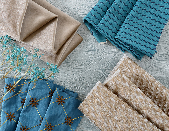 米白色調中加入適當比例的棕色,以天然的古樸抵抗歲月的痕跡;藍色刺繡提花栩栩如生,精致細膩中糅著典雅的矜持,承襲著悠久的傳統工藝,繡制華美藝術。